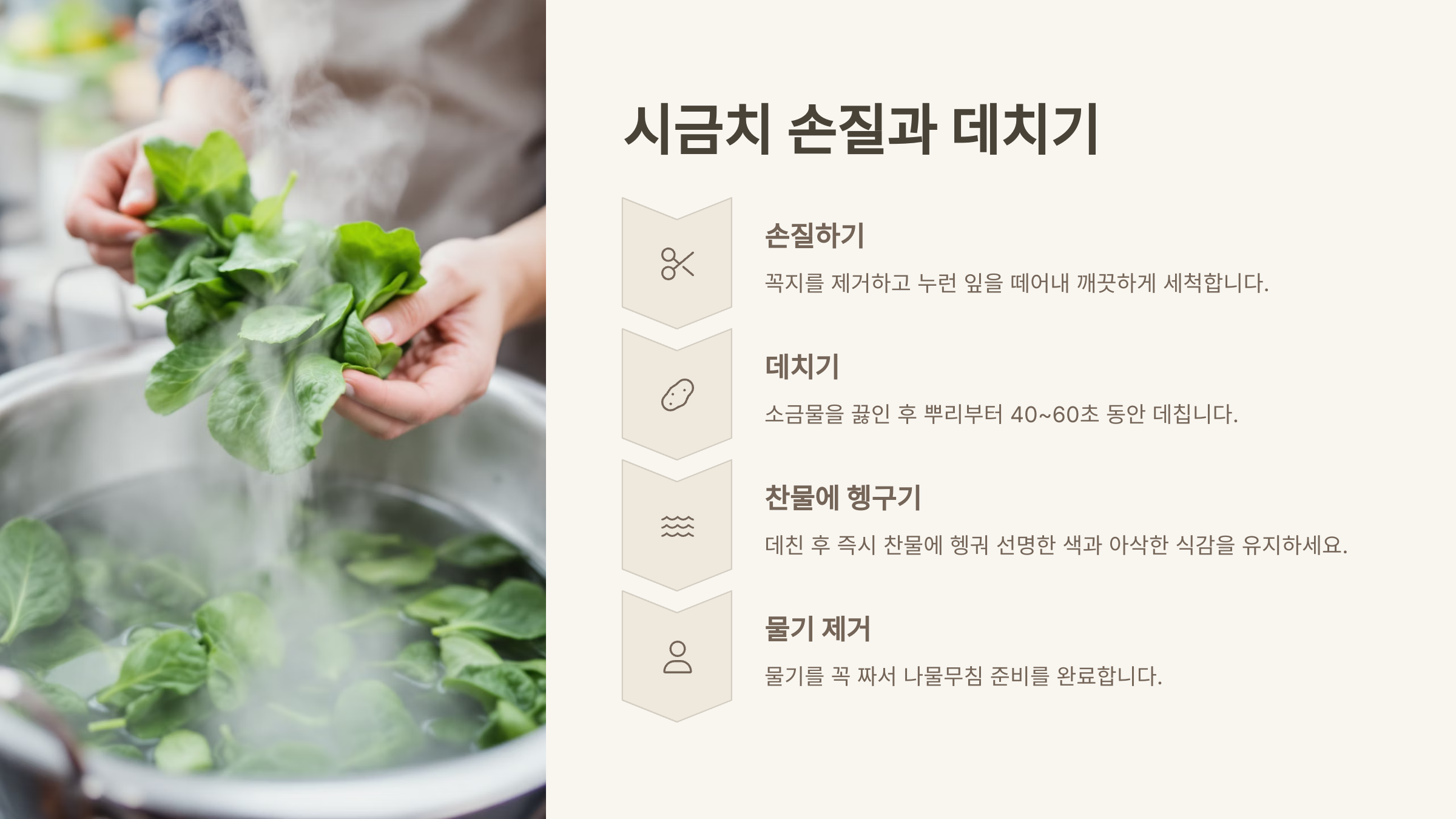 너무 오래 데치면 영양소가 파괴되고 식감이 물러지므로, 짧게 데치는 것이 맛있는 시금치나물을 만드는 핵심입니다.
