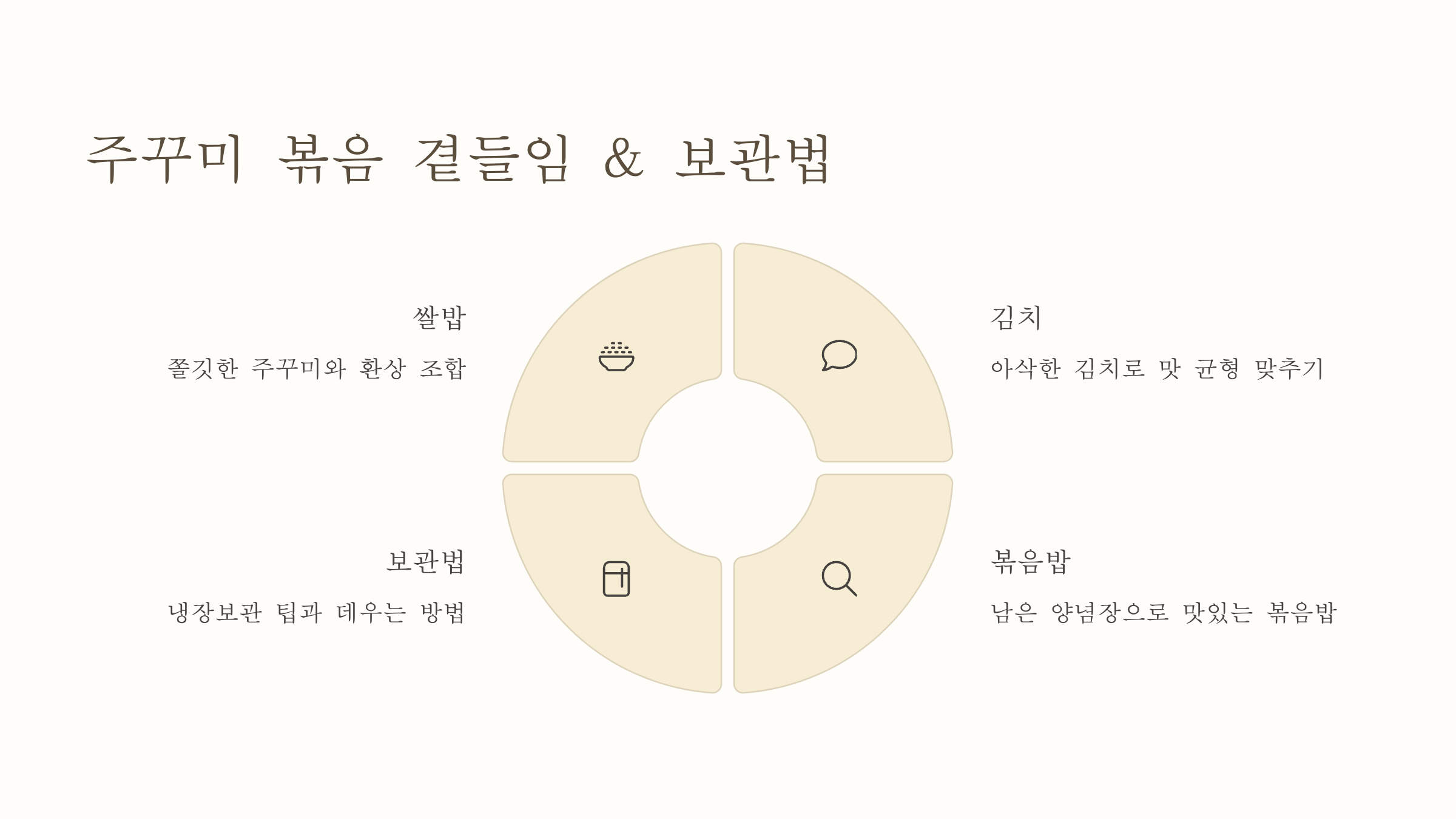 - 밥도둑 조합: 따끈한 흰쌀밥 위에 주꾸미 볶음을 듬뿍 올려 슥슥 비벼 먹으면 꿀맛! 김가루나 날치알을 추가하면 더욱 풍성하게 즐길 수 있습니다.