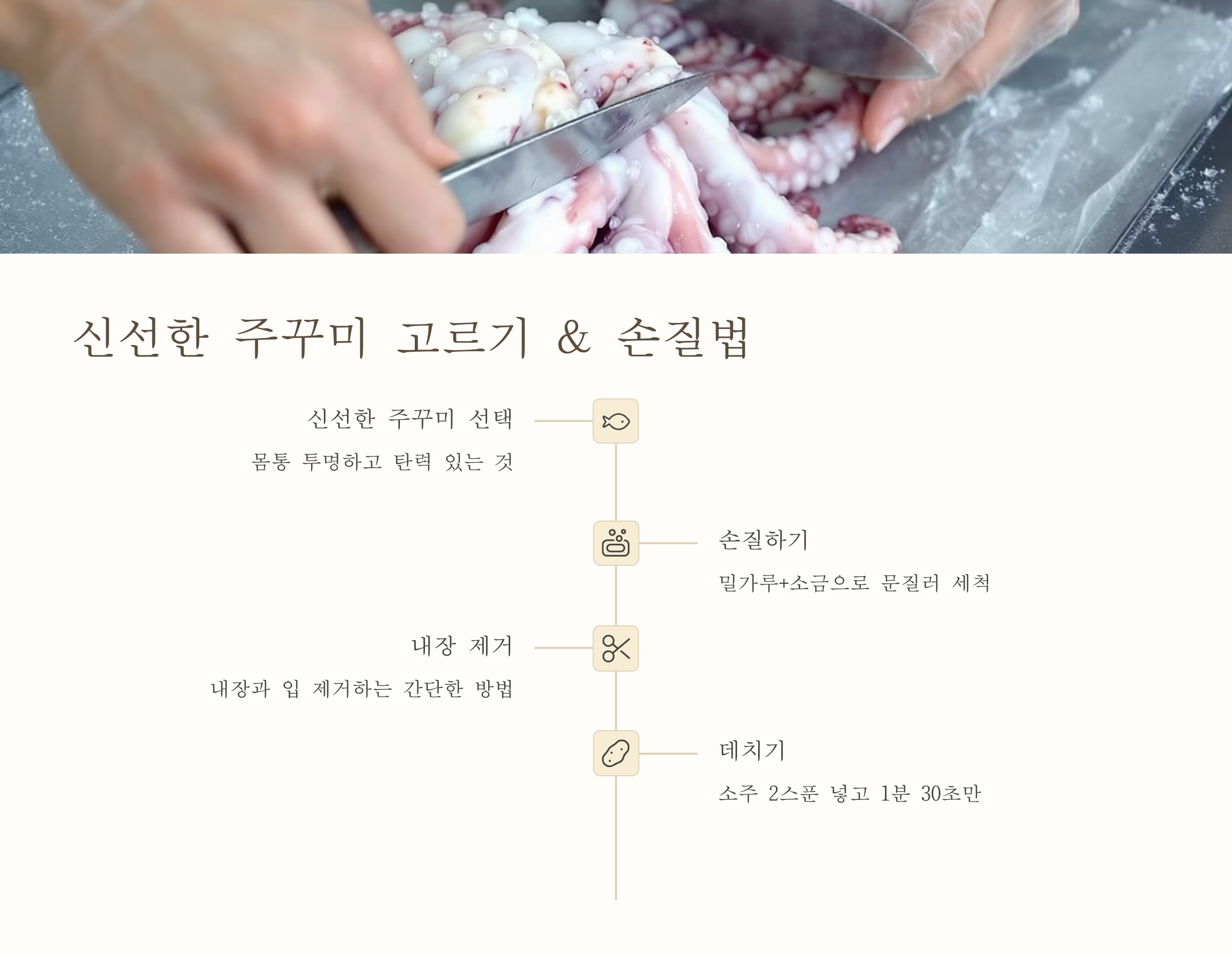 - 눈과 입 제거: 주꾸미 눈은 가위로 잘라내고, 다리 가운데 있는 딱딱한 입은 손으로 눌러 빼냅니다.