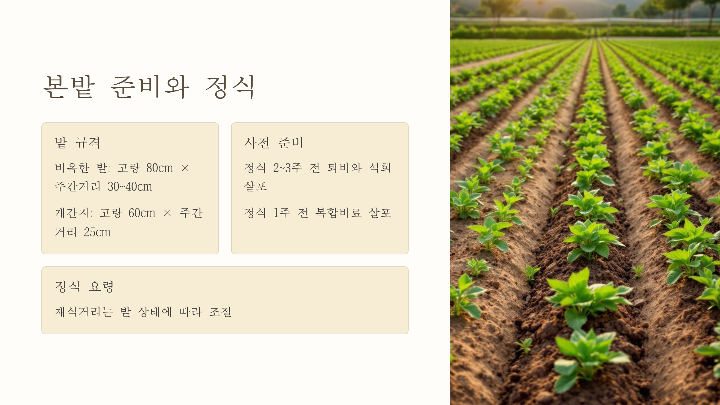 • 파종 간격: 포기 사이 간격은 20~30cm, 줄 사이 간격은 60~70cm가 적당합니다. 너무 촘촘하게 심으면 통풍이 불량해져 병해가 발생하기 쉽습니다.