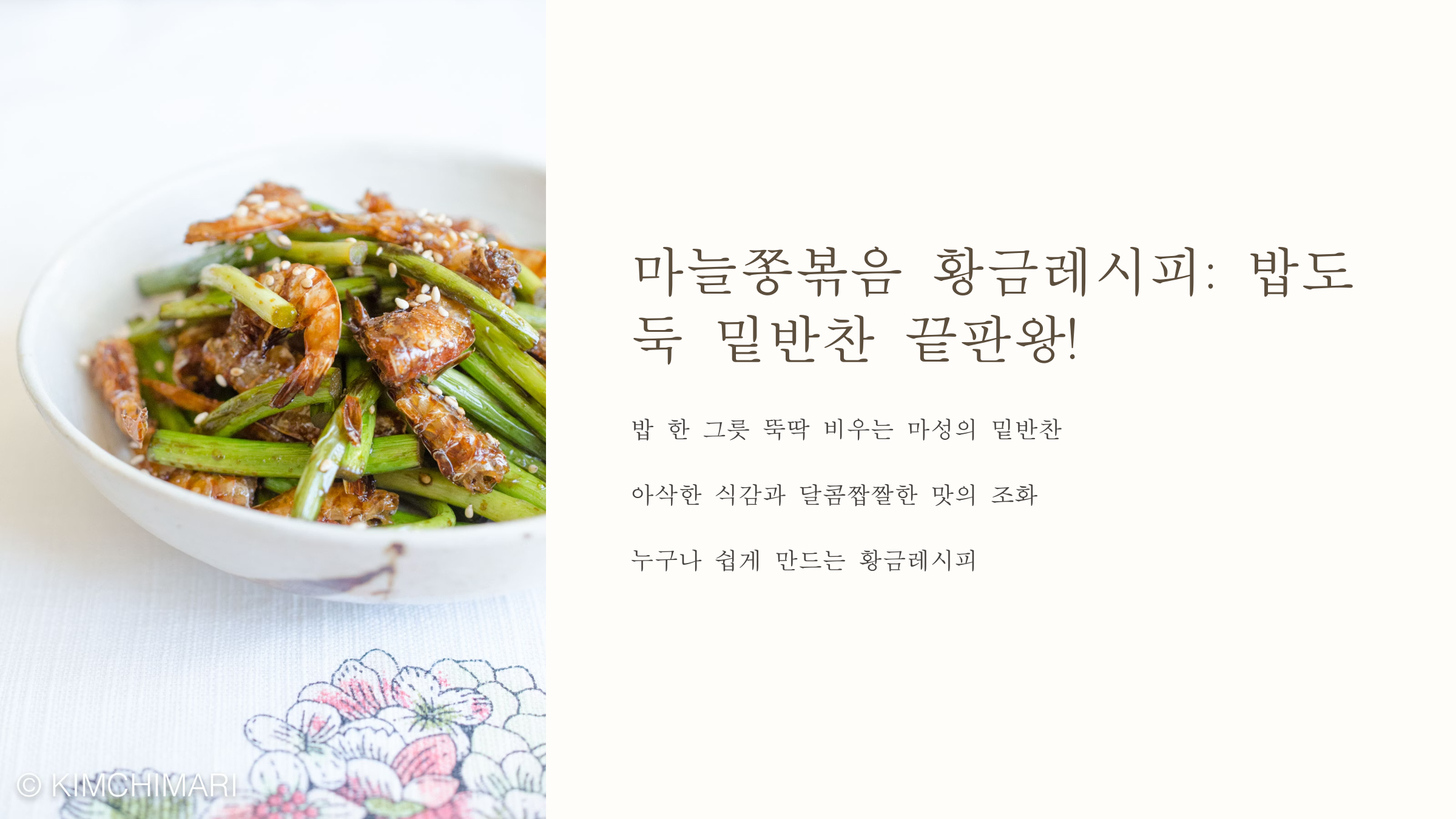 안녕하세요! 😊 오늘은 입맛 없을 때 밥 한 그릇 뚝딱 비우게 만드는 마성의 밑반찬, 바로 마늘쫑볶음볶음 황금레시피를 소개해 드리려고 합니다. 아삭아삭 씹히는 식감과 달콤짭짤한 양념의 조화가 일품인 마늘쫑볶음은 남녀노소 누구나 좋아하는 인기 반찬이죠.