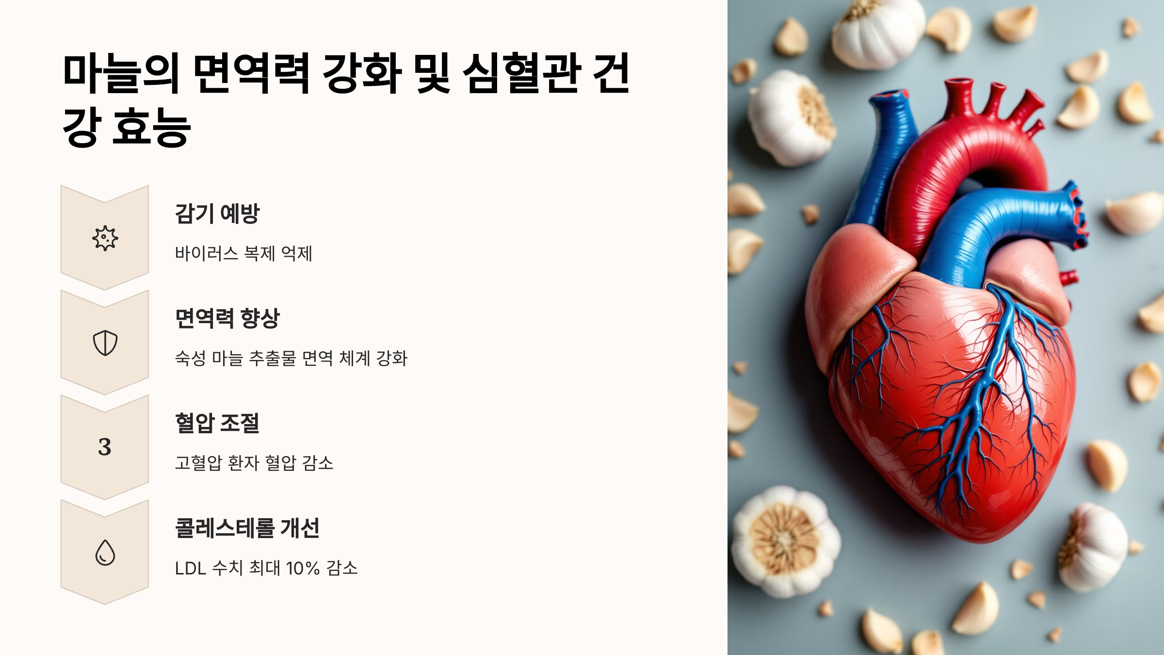 마늘 효능 중 가장 널리 알려진 것은 바로 심혈관 건강 개선입니다. 마늘은 혈압을 낮추고 콜레스테롤 수치를 조절하는 데 도움을 줍니다. 미국 심장 협회(American Heart Association)의 연구에 따르면, 매일 마늘 추출물을 섭취한 고혈압 환자들은 수축기 혈압이 평균 8-10mmHg 감소하는 효과를 보였습니다.