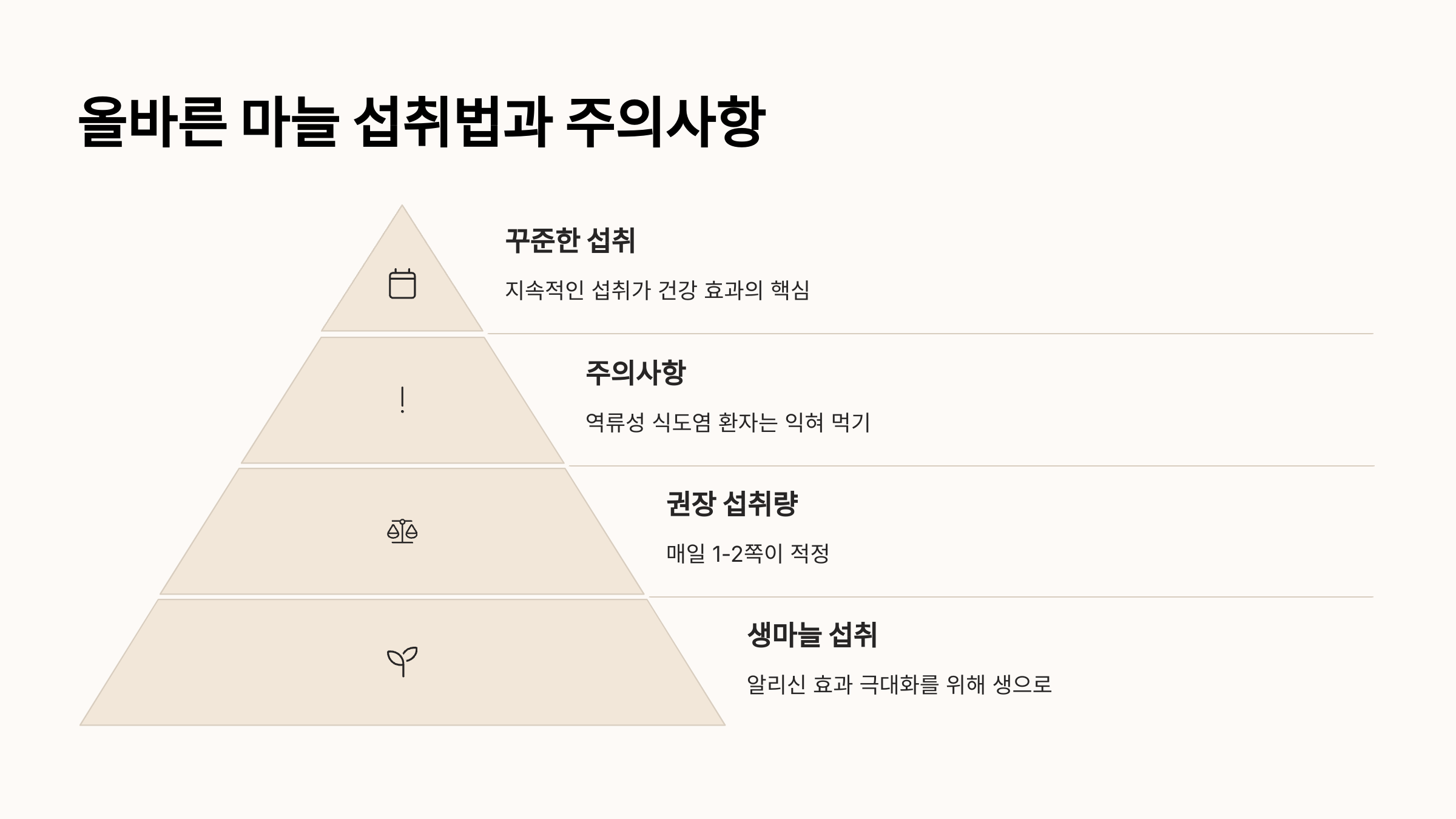 • 하루 권장 섭취량은 생마늘 기준 1-2쪽(3-6g) 정도입니다.