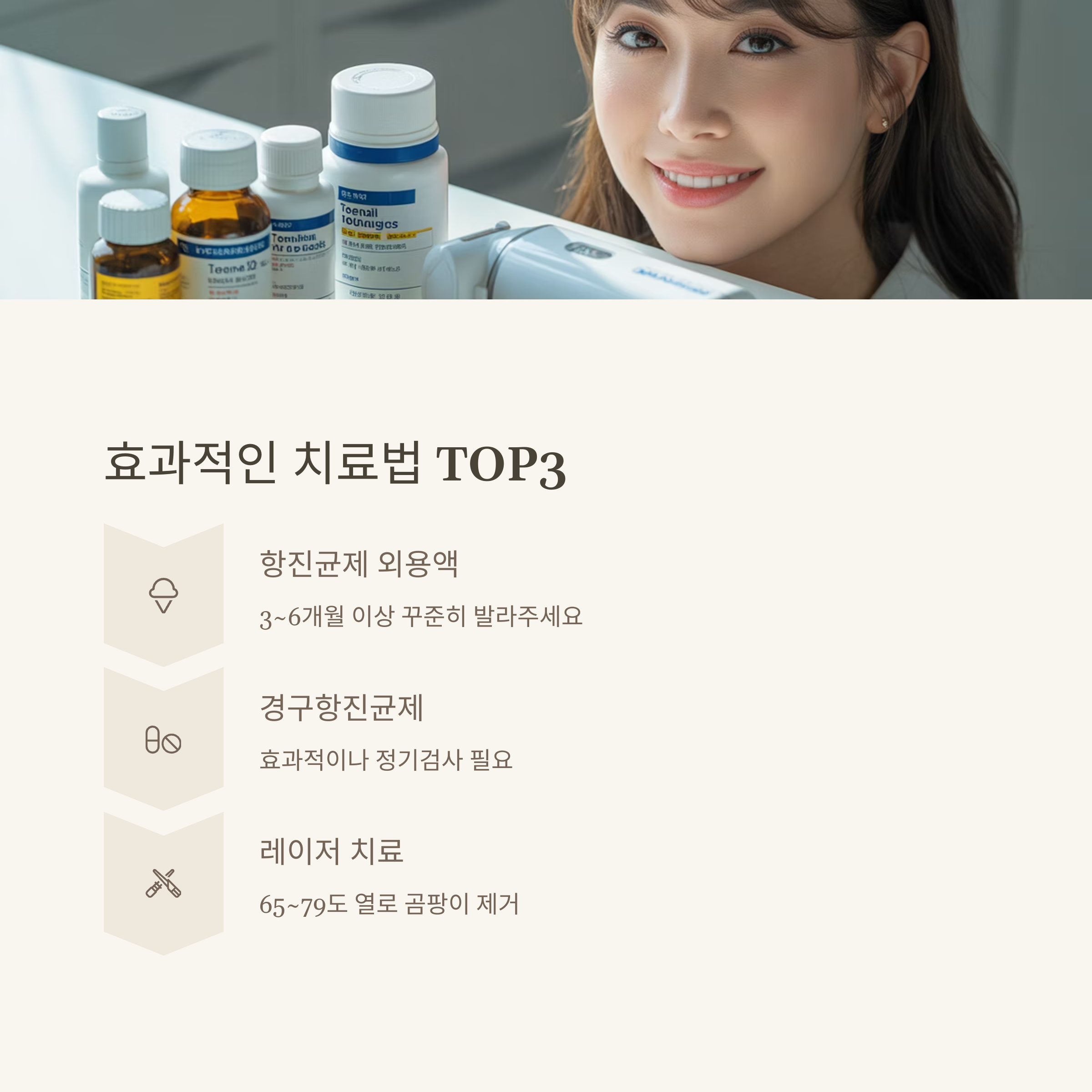 레이저 치료 레이저로 곰팡이균 사멸 통증 적음, 약물 부작용 우려 시 반복 치료 필요, 비용 부담