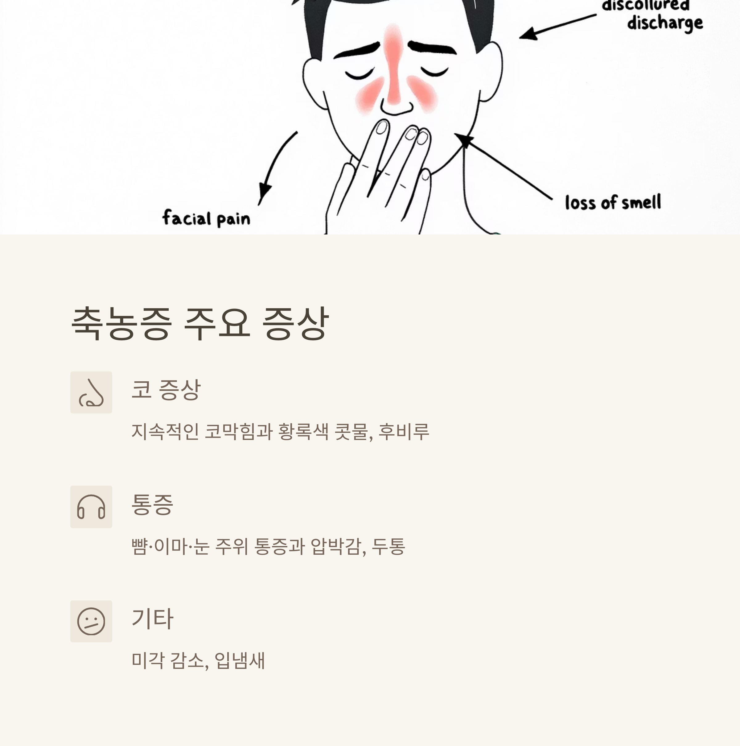 - 두통: 전두동이나 사골동 염증 시 심해짐
