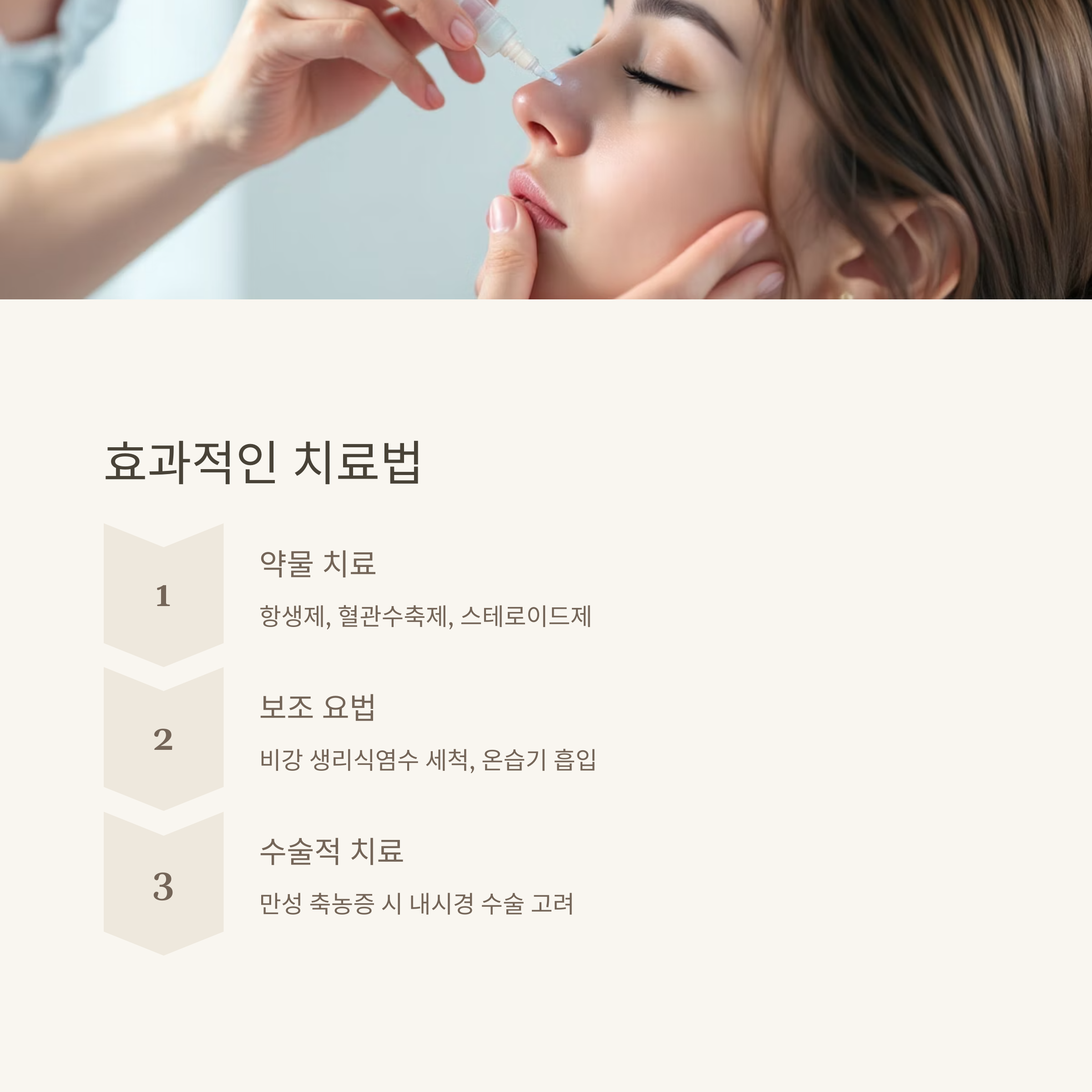 - 생리식염수 비강 세척: 하루 1-2회 비강을 세척하여 염증 유발 물질과 분비물 제거