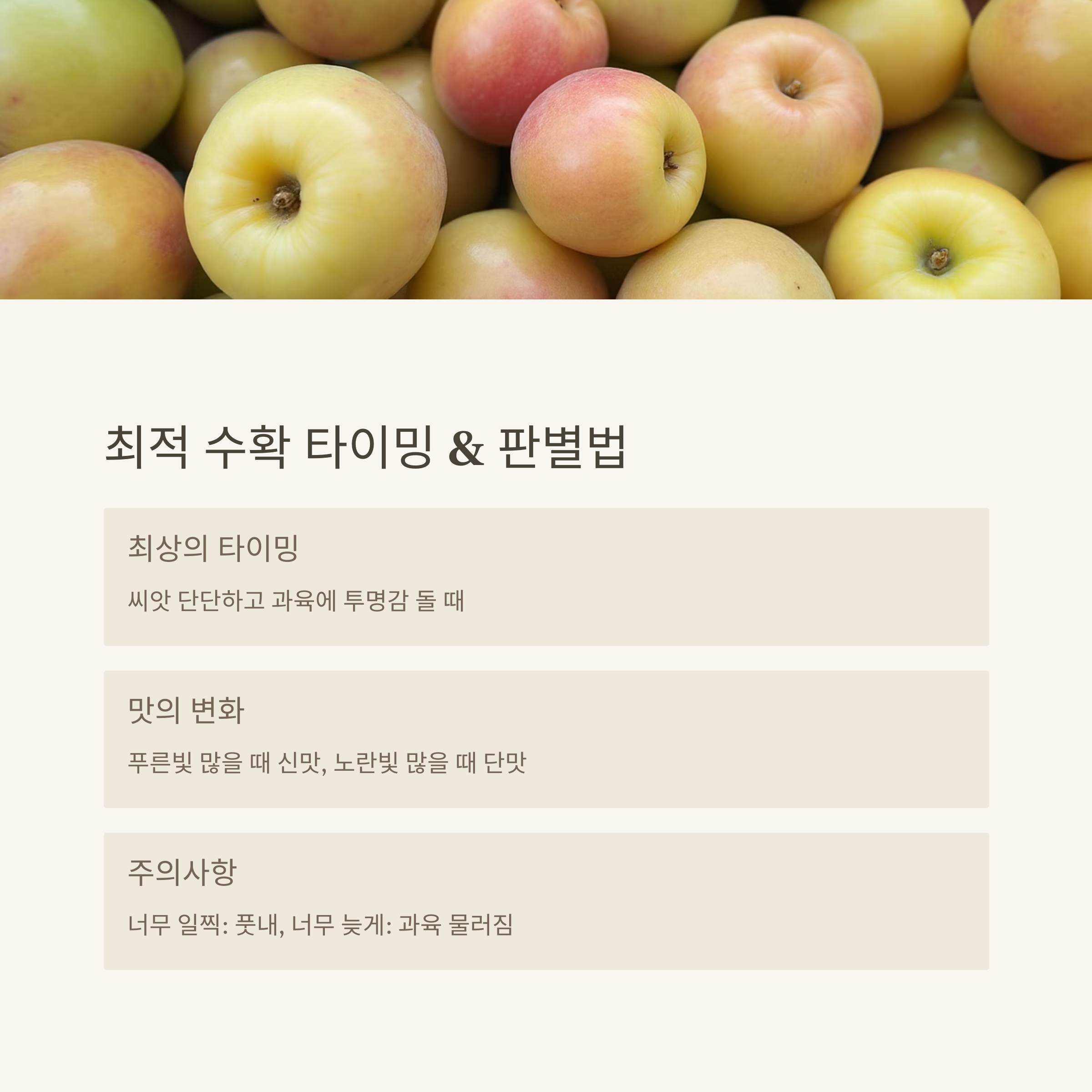 매실 수확시기를 판단하는 기준은 주로 '색깔'과 '크기'입니다. 매실은 초록색에서 점차 노란색으로 변하기 시작할 때가 수확의 적기입니다. 완전히 노랗게 익었을 때는 이미 신맛이 줄어들고 향이 날아가 매실청이나 장아찌로 활용하기에는 적합하지 않습니다.