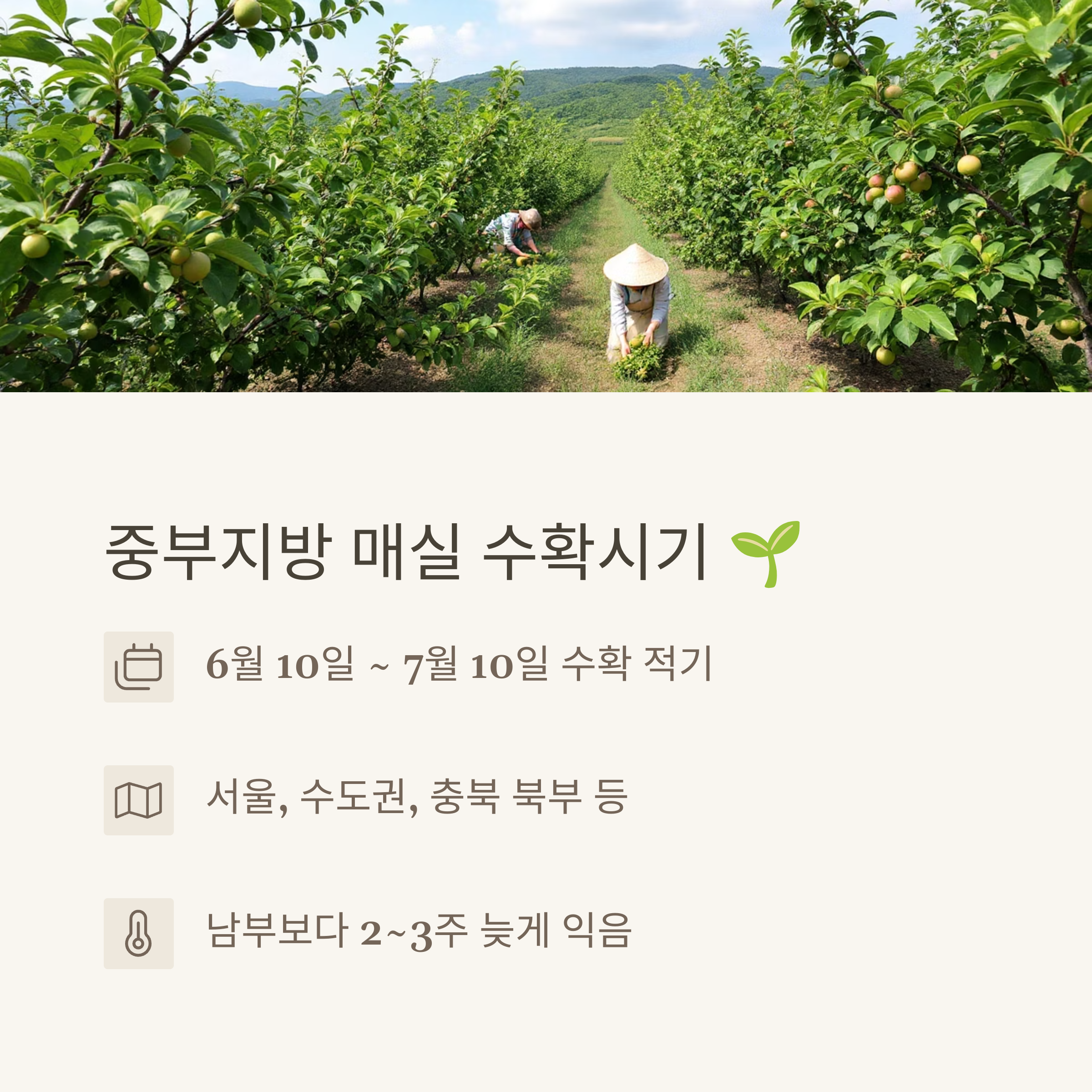 중부지방(충청도, 경기도, 강원도 일부)은 남부지방보다 기온이 낮아 매실의 생육 속도가 다소 늦습니다. 중부지방의 매실 수확시기는 다음과 같습니다: