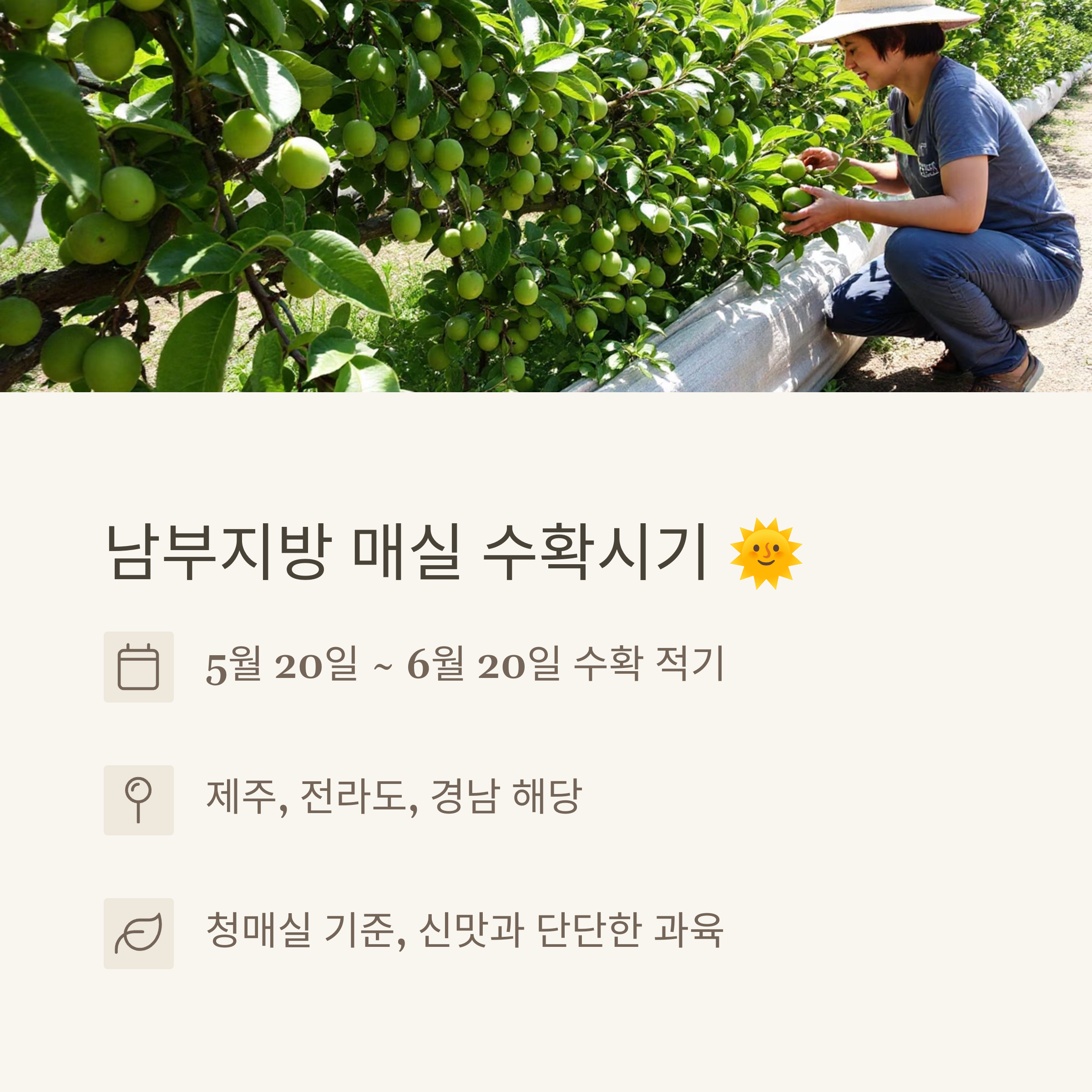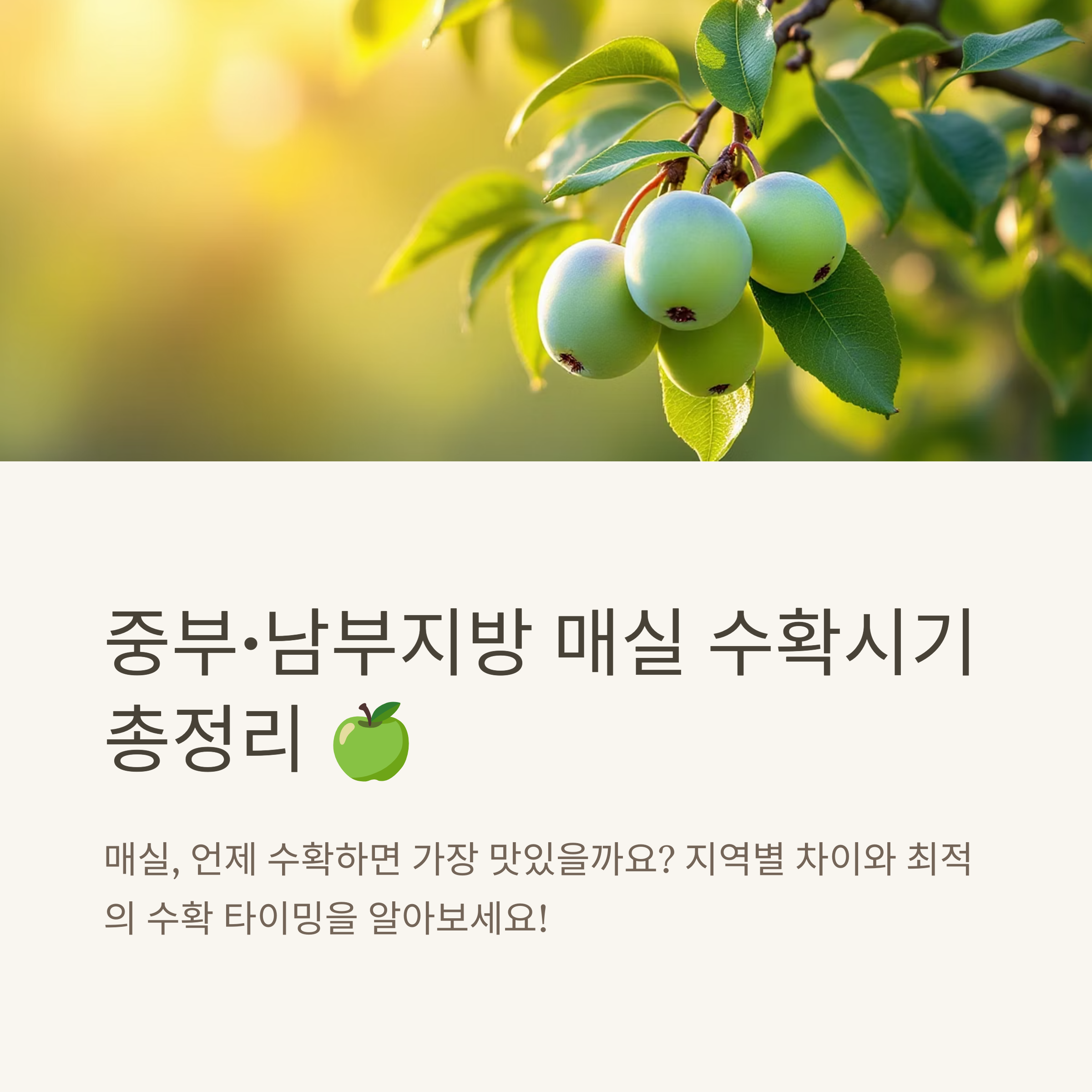 남부지방(전라도, 경상도, 제주도 등)은 기후가 온화하여 매실 생육이 빠르게 진행됩니다. 이 지역의 매실 수확시기는 다음과 같습니다: