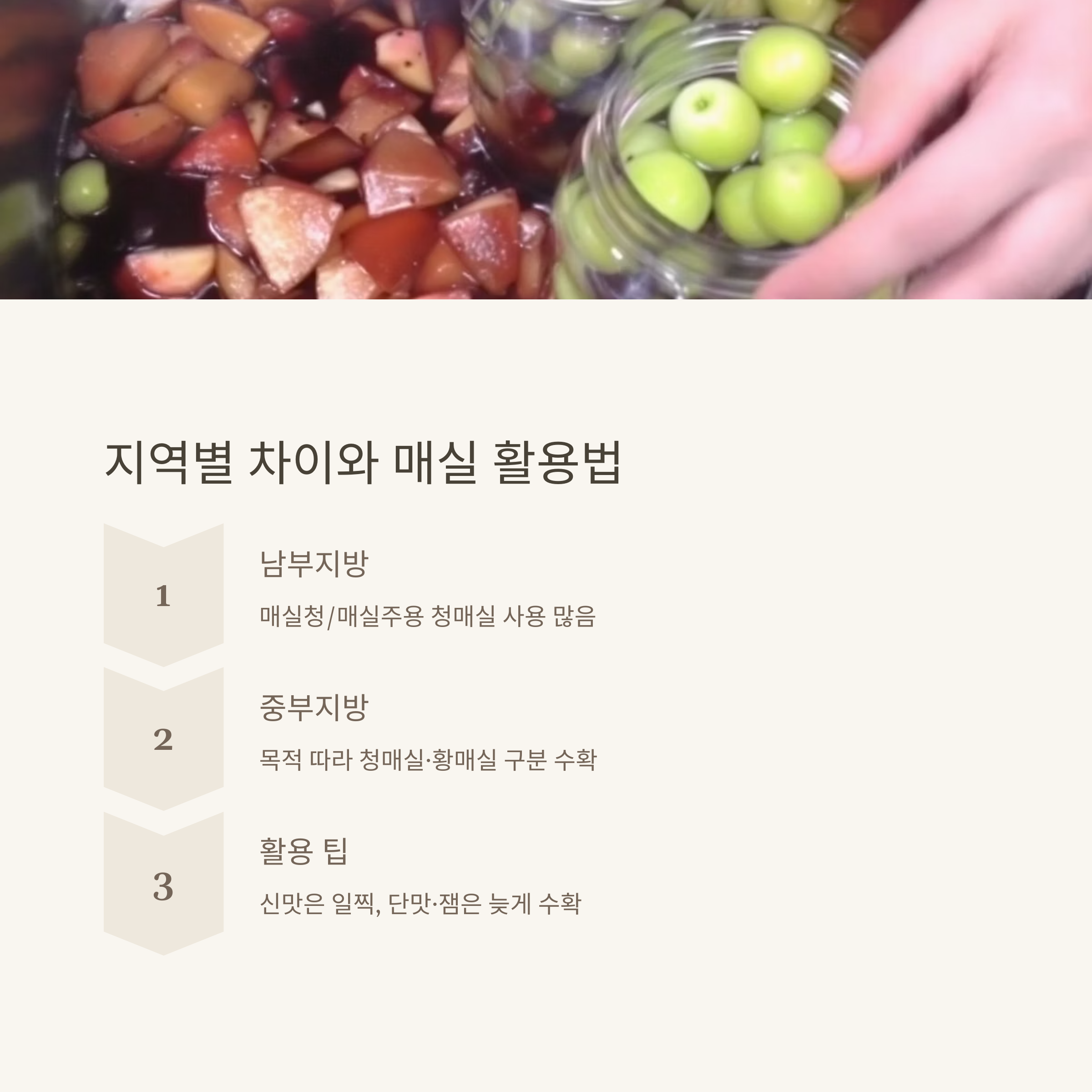 A: 매실청용은 초록색에서 약간 노란빛이 돌기 시작할 때(착색률 10-20%)가 적합하며, 장아찌용은 조금 더 익은 상태(착색률 20-30%)가 좋습니다. 매실청은 신맛과 향이 중요하고, 장아찌는 약간 더 익은 것이 식감이 좋기 때문입니다.