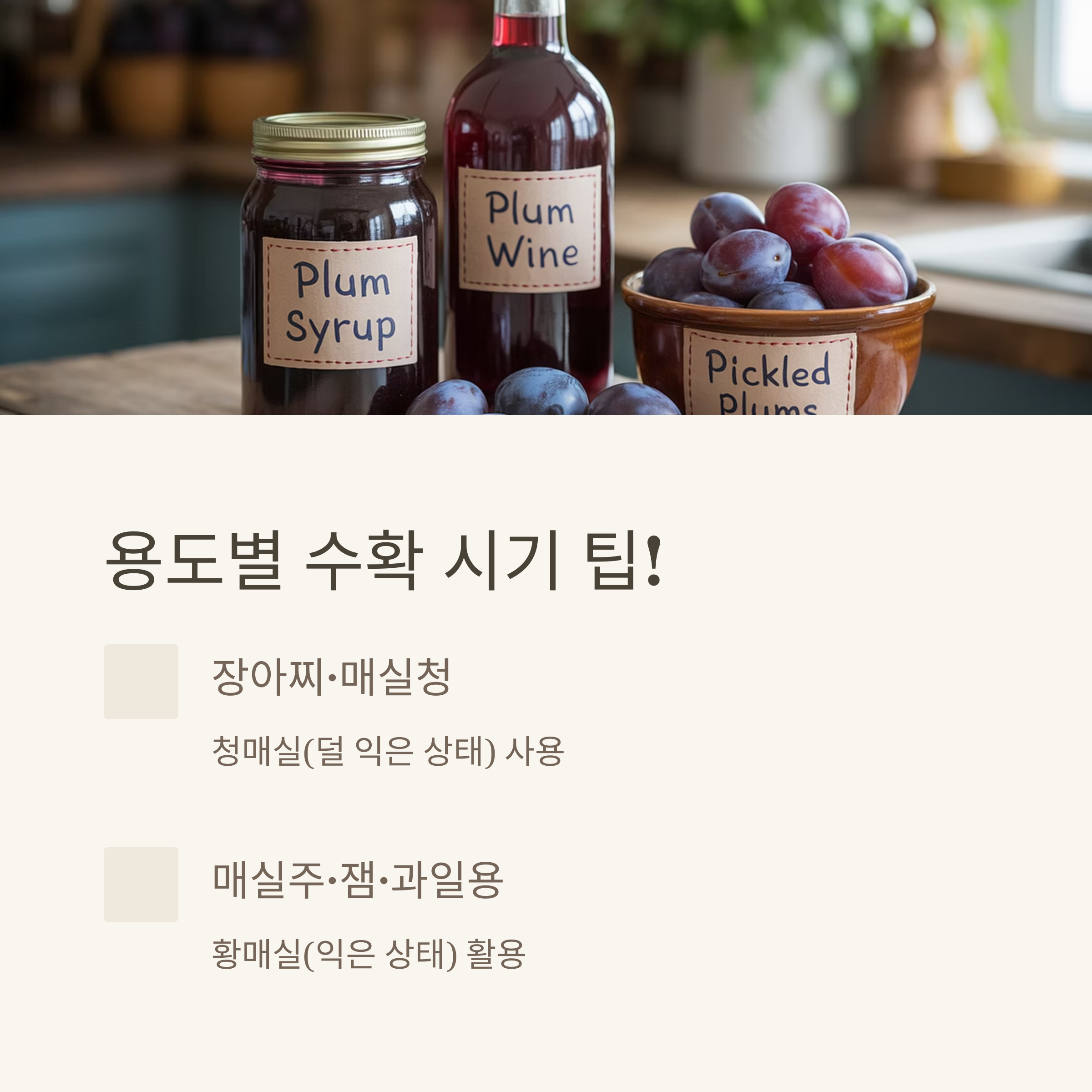 | 청매실 | 과육 단단, 신맛 강함, 푸른빛 | 매실청, 장아찌, 매실액기스 | 5월 말 ~ 6월 중순 |