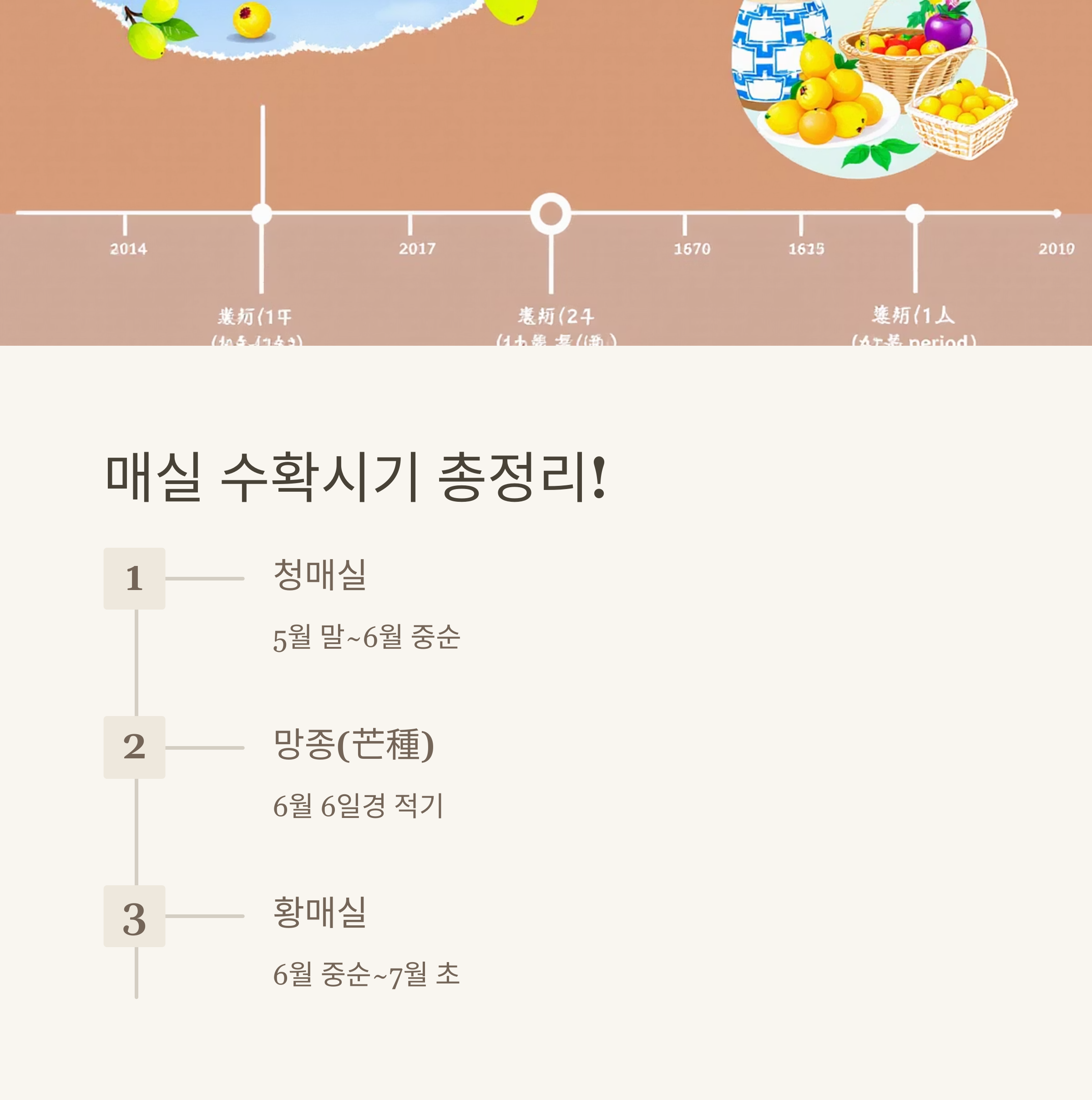 전반적으로 우리나라의 매실 수확시기는 6월 초순부터 6월 하순까지로 볼 수 있어요. 특히 24절기 중 하나인 '망종'(보통 6월 5~6일경)을 전후로 매실 수확이 본격적으로 시작된답니다.