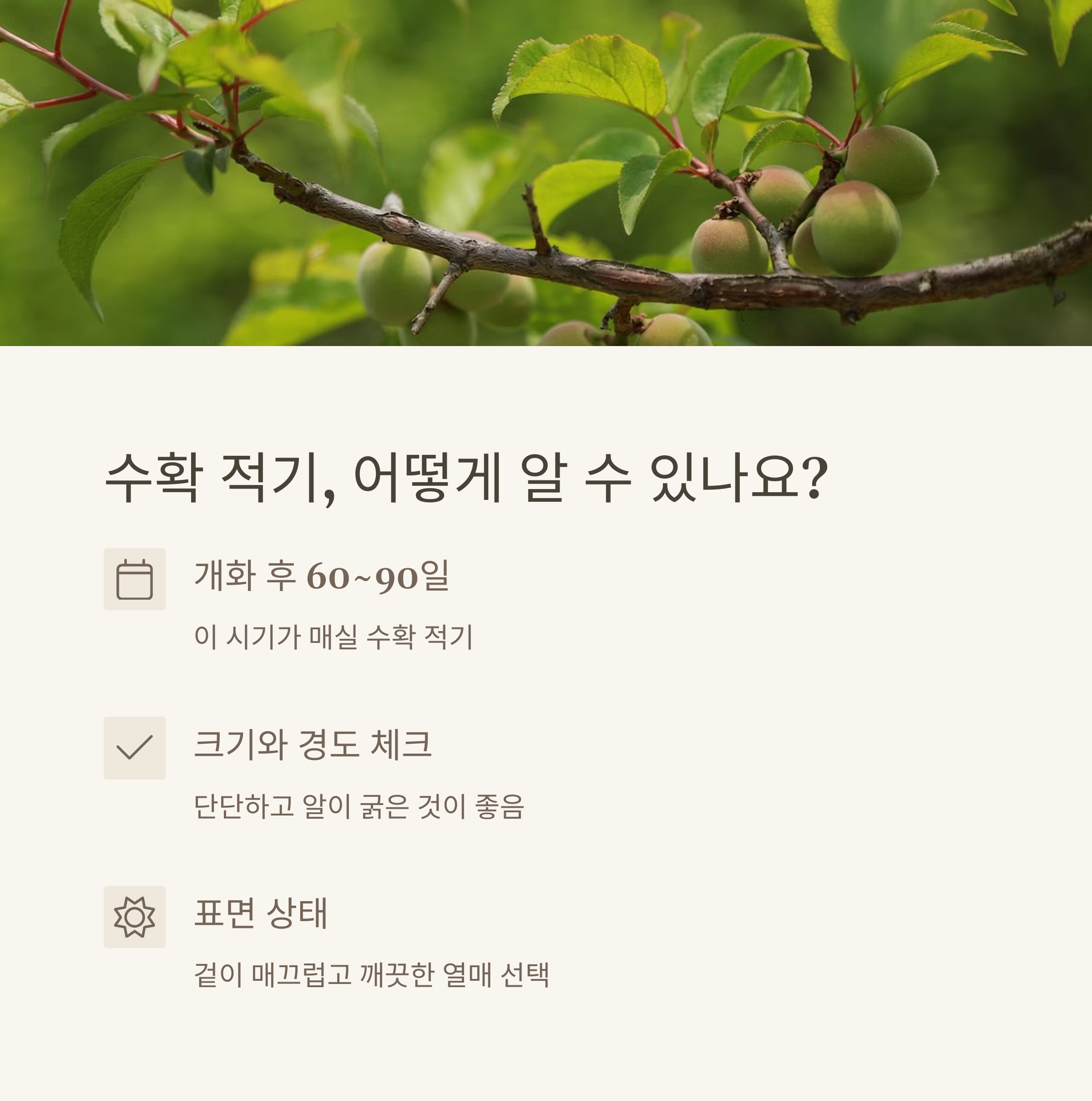 -수확 시간: 이슬이 마른 오전 시간이 가장 좋아요. 비 오는 날이나 비 온 직후에는 수분이 많아 매실이 무르거나 상하기 쉬우니 피해주세요.