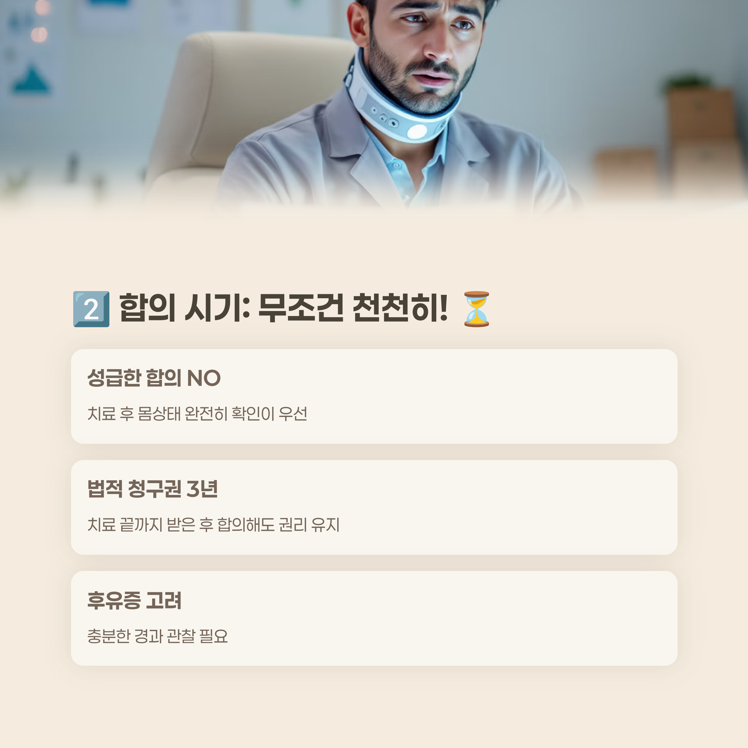 섣부른 조기 합의는 나중에 발생할 수 있는 후유증에 대한 치료비나 추가 손해배상을 청구하기 어렵게 만듭니다. 특히 골절, 디스크, 신경 손상 등이 있는 경우, 충분한 치료와 재활 기간을 거친 후 의사의 전문적인 소견을 듣고 후유장해 여부 및 정도를 판단한 뒤 합의를 진행하는 것이 현명한 교통사고 합의 요령 입니다.