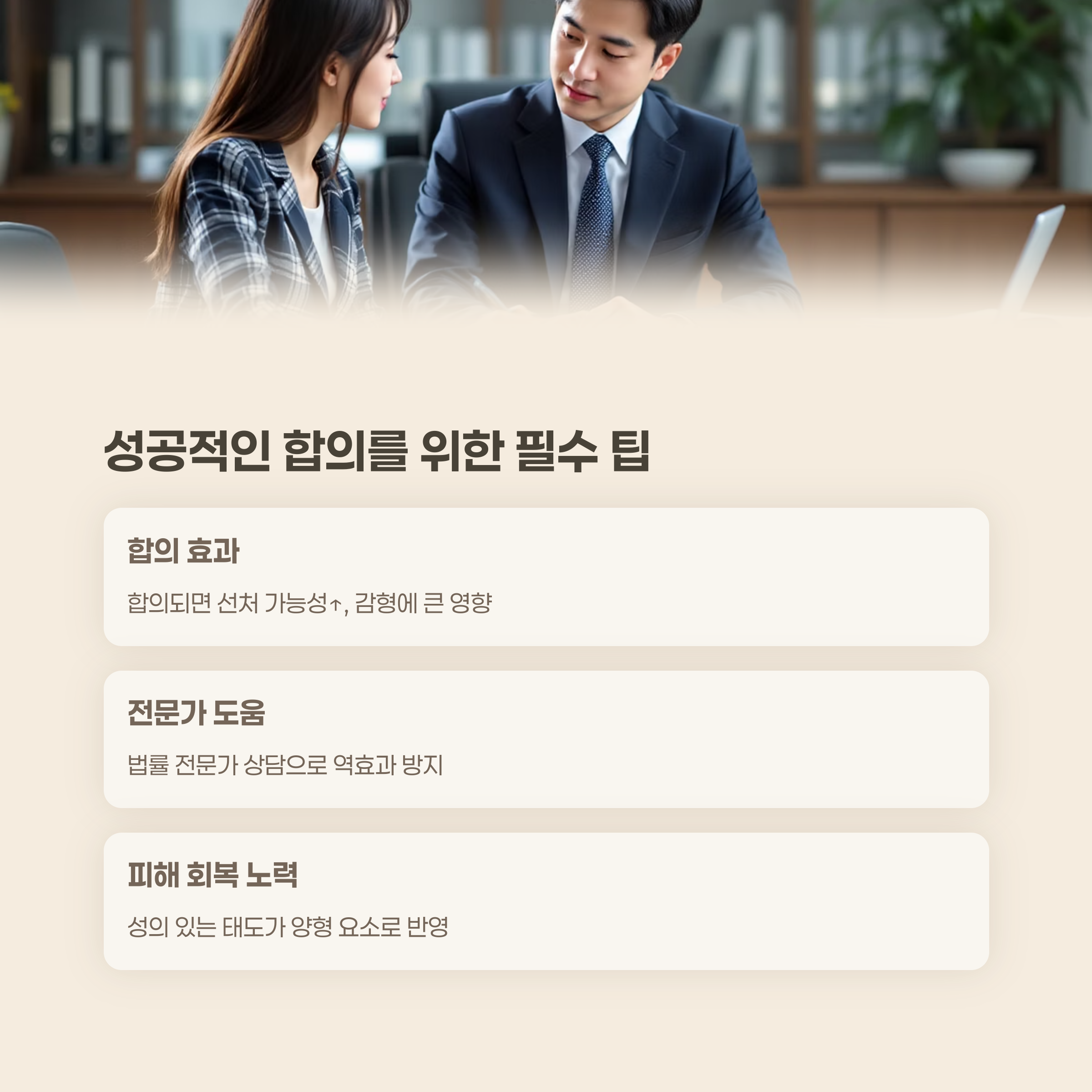 이때, 피해자와의 형사합의는 처벌 수위를 낮추는 데 결정적인 역할을 합니다. 진심으로 사과하고 피해 회복을 위해 노력하는 모습을 보이면, 검찰 처분이나 법원 판결에서 감형 요소로 참작될 가능성이 매우 높아집니다. 실형을 피하거나 벌금액을 줄이는 데 큰 도움이 될 수 있어요.