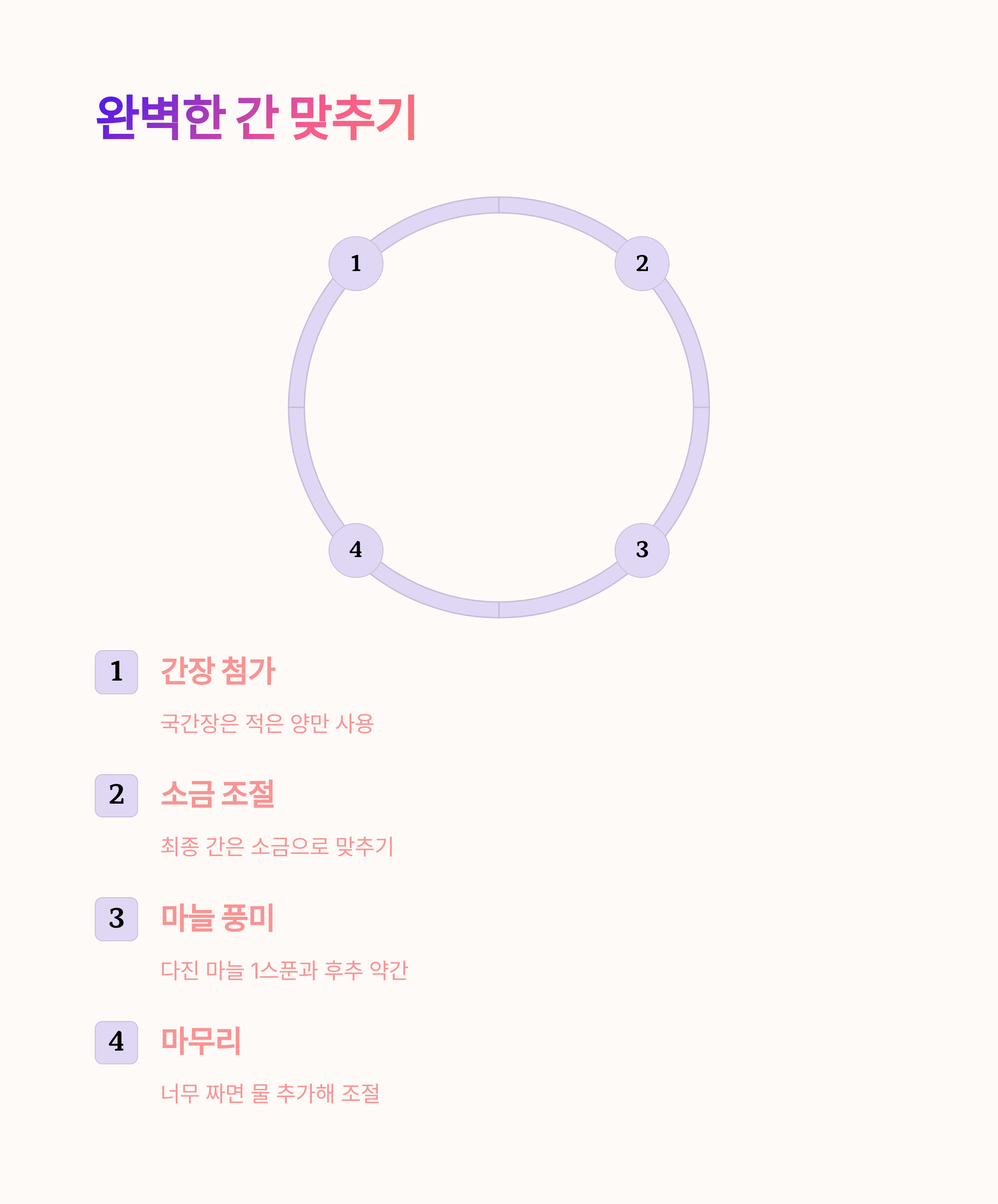 | 멸치액젓/참치액젓 | 특유의 감칠맛과 풍미가 뛰어남 | 국간장과 함께 사용하거나 마지막에 넣어 풍미를 더함. (소량만 사용) |