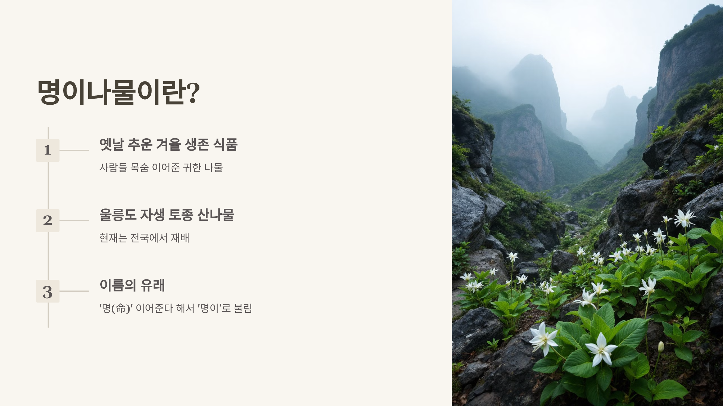 명이나물은 산마늘로도 불리는 한국 고유의 산나물이에요. 울릉도와 강원도에서 주로 재배되며, 알싸한 마늘 향과 아삭한 식감이 특징이죠.