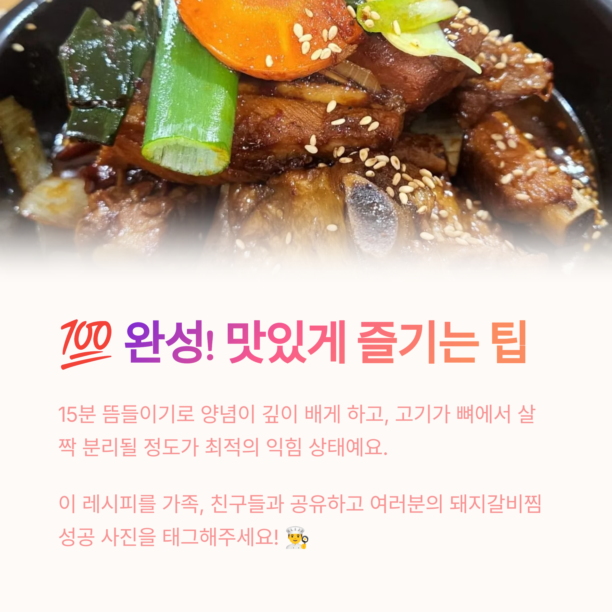 오늘 알려드린 돼지갈비찜 맛있게 만드는 법과 여러 꿀팁들이 여러분의 요리 시간에 즐거움을 더해주길 바랍니다. 정성껏 만든 맛있는 돼지갈비찜으로 가족, 친구들과 행복한 시간을 보내세요! 이 레시피대로라면 분명 모두에게 칭찬받는 근사한 요리가 완성될 거예요. 맛있게 드세요! 🥳