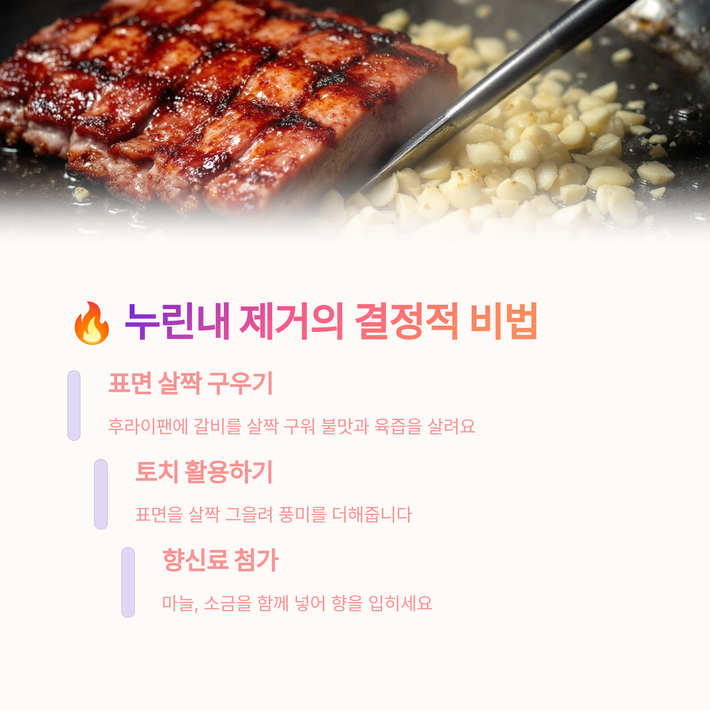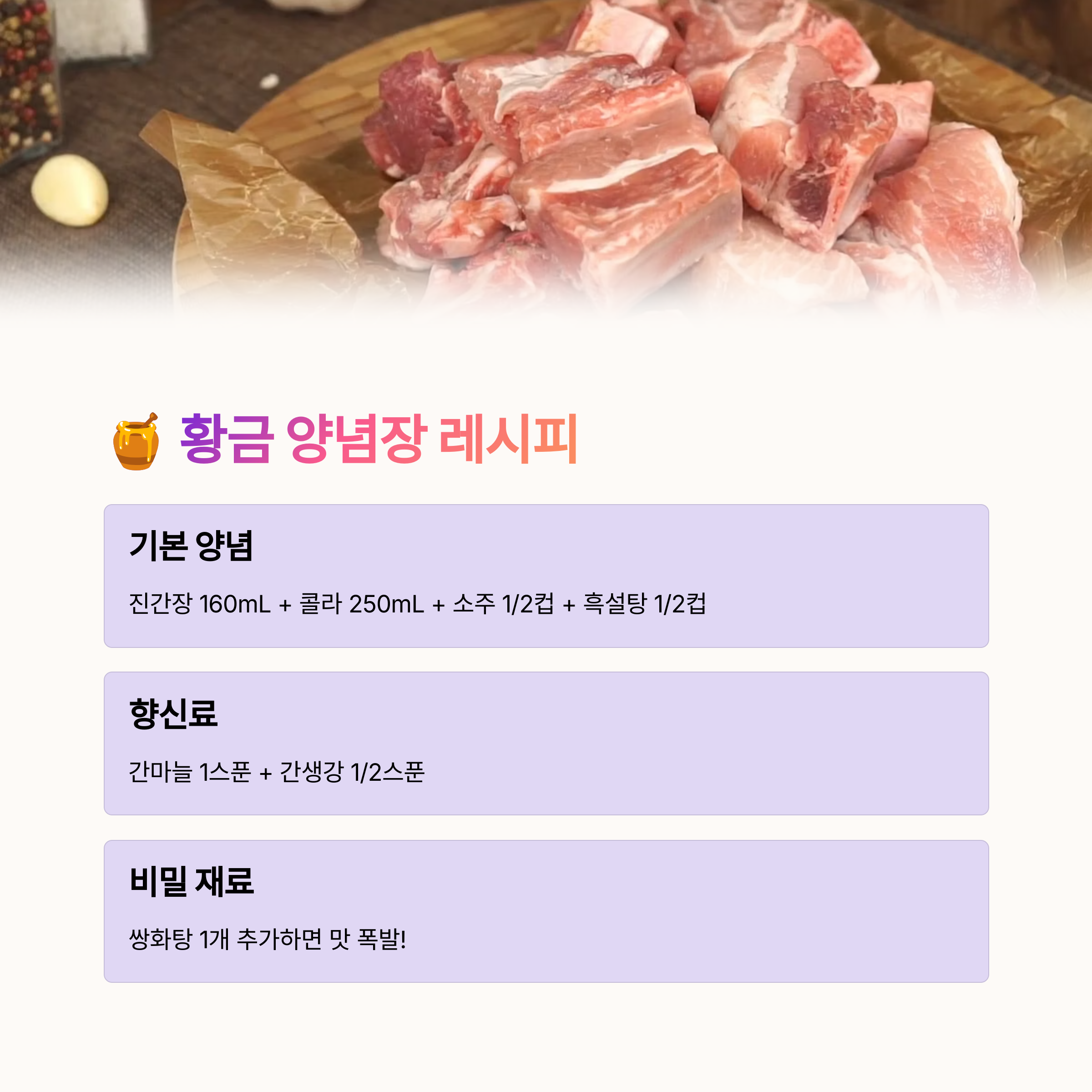 깊은 풍미 더하기: 양념장에 커피 가루를 아주 약간 넣거나, 노두유(중국 간장)를 조금 사용하면 색감과 풍미를 동시에 잡을 수 있습니다.