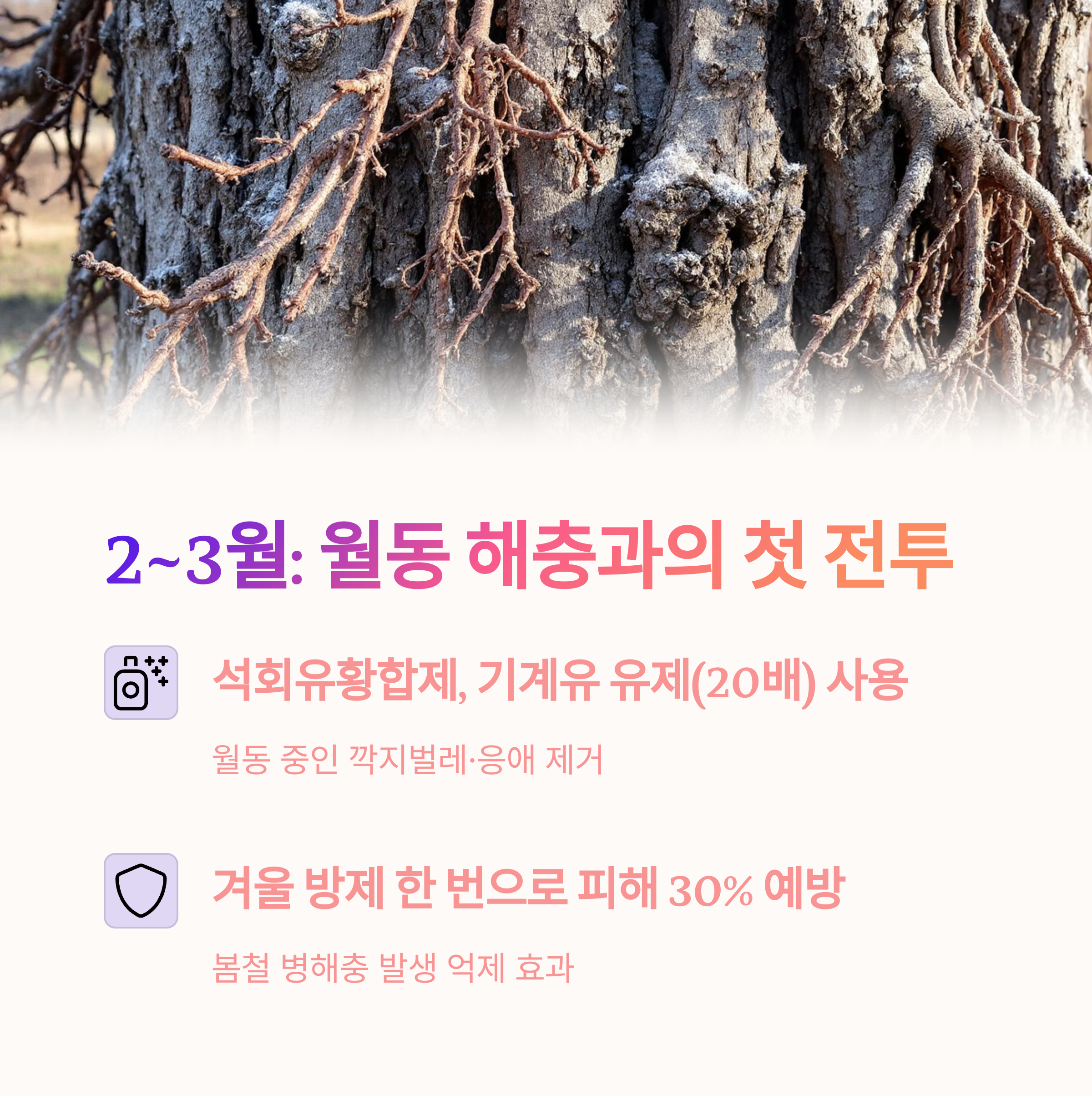 동절기 (12월~2월) 월동 병해충 (깍지벌레, 응애 알, 조피 속 해충) 기계유유제 살포 (2월 중하순), 조피 제거