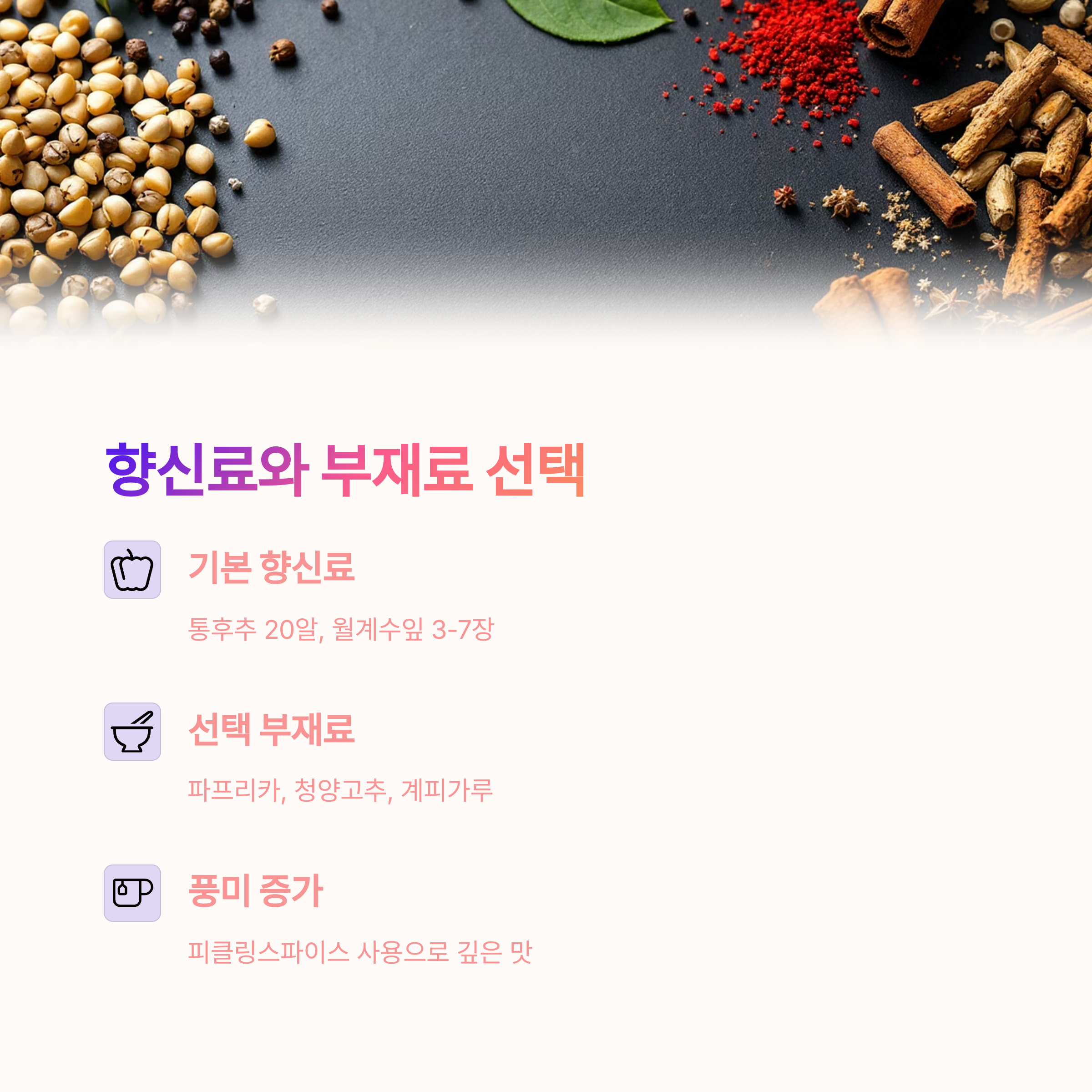 | 향신료 (선택) | 피클링 스파이스 | 1큰술 | 월계수잎, 통후추, 정향 등 대체 가능 |