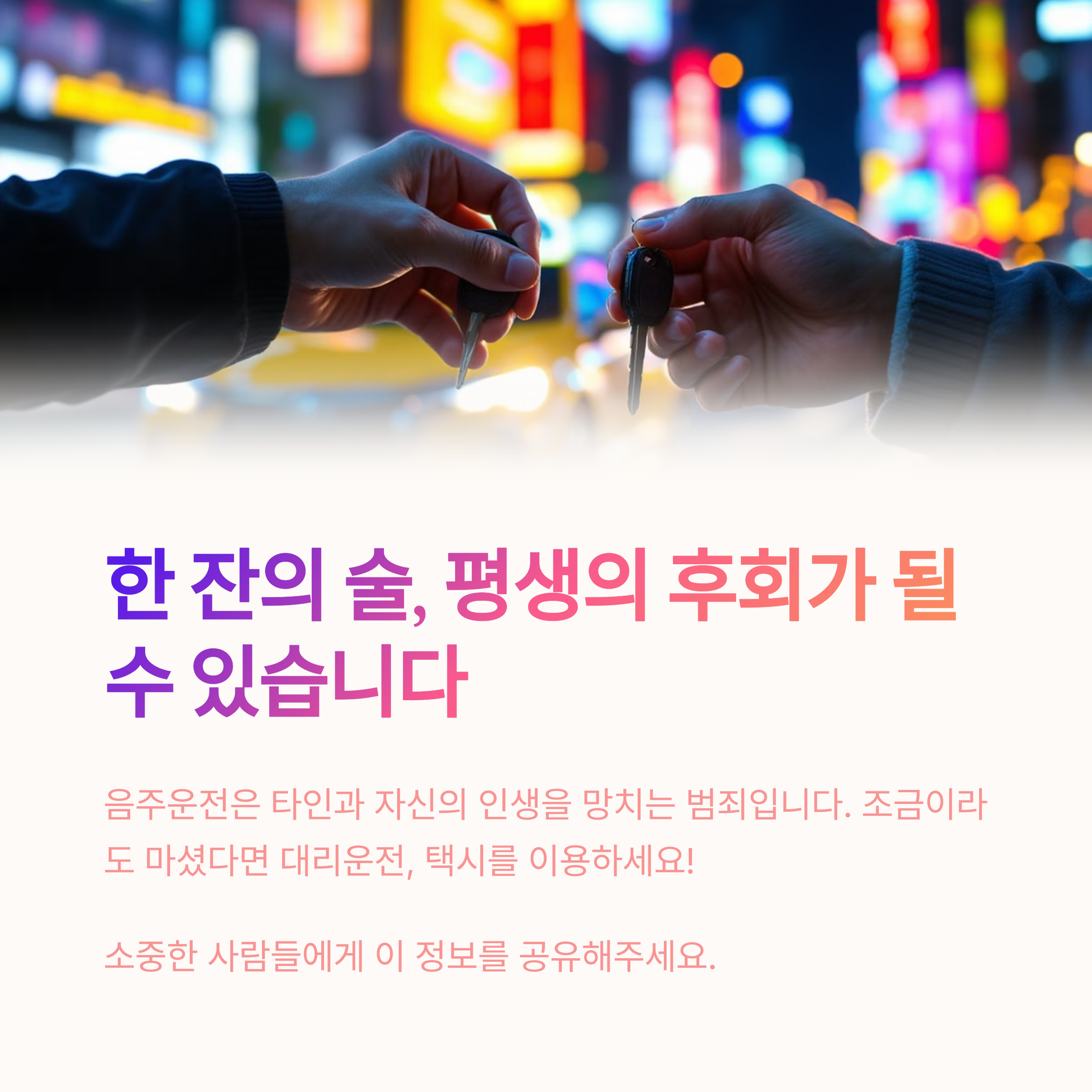 "나 하나쯤 괜찮겠지"라는 생각이 돌이킬 수 없는 결과를 초래할 수 있다는 점을 항상 기억하시고, 자신과 타인의 안전을 위해 음주운전은 절대 하지 않겠다는 다짐을 새기는 계기가 되셨기를 바랍니다. 🙏 안전 운전하세요!