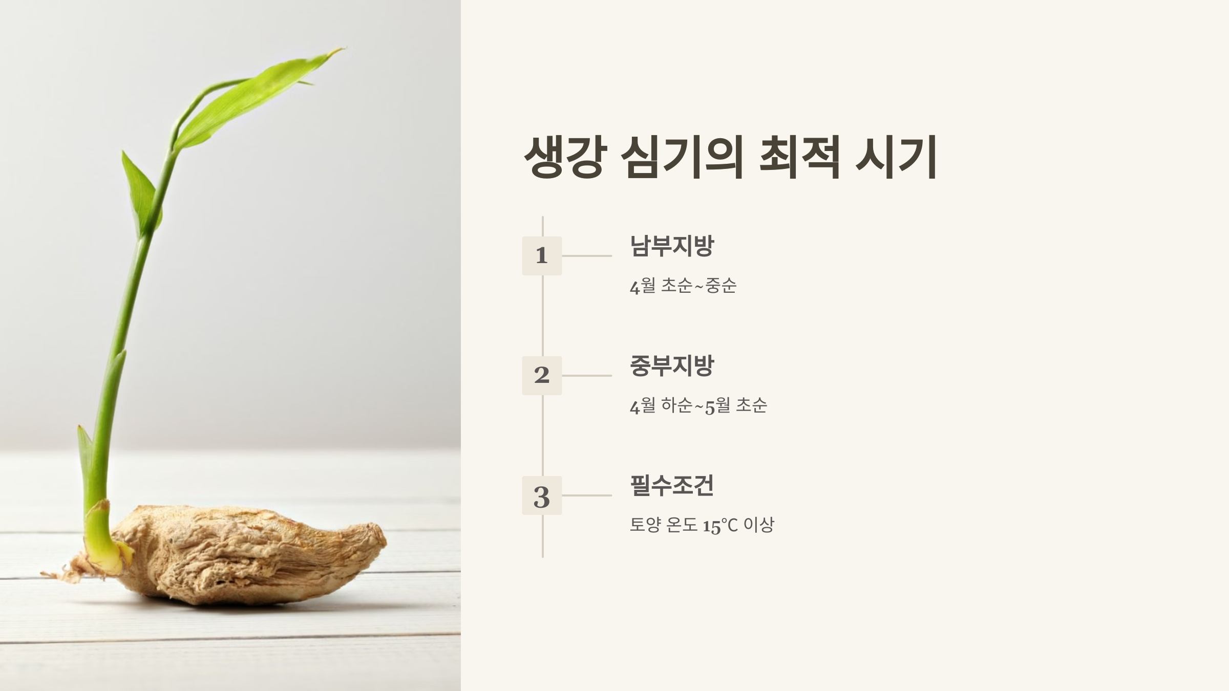 생강은 따뜻한 기온(20~30℃)에서 잘 자라기 때문에, 지역별로 심는 시기가 조금 달라요.
