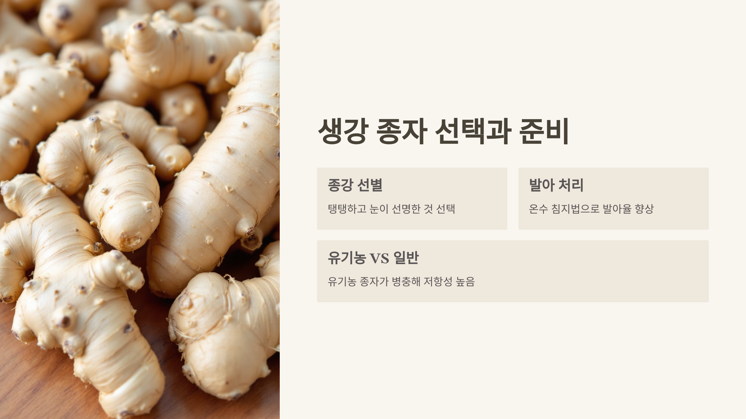 1. 종강 준비: 건강한 씨생강을 골라요. 무게는 20~30g, 싹눈 2~3개가 붙어 있는 걸 추천해요.