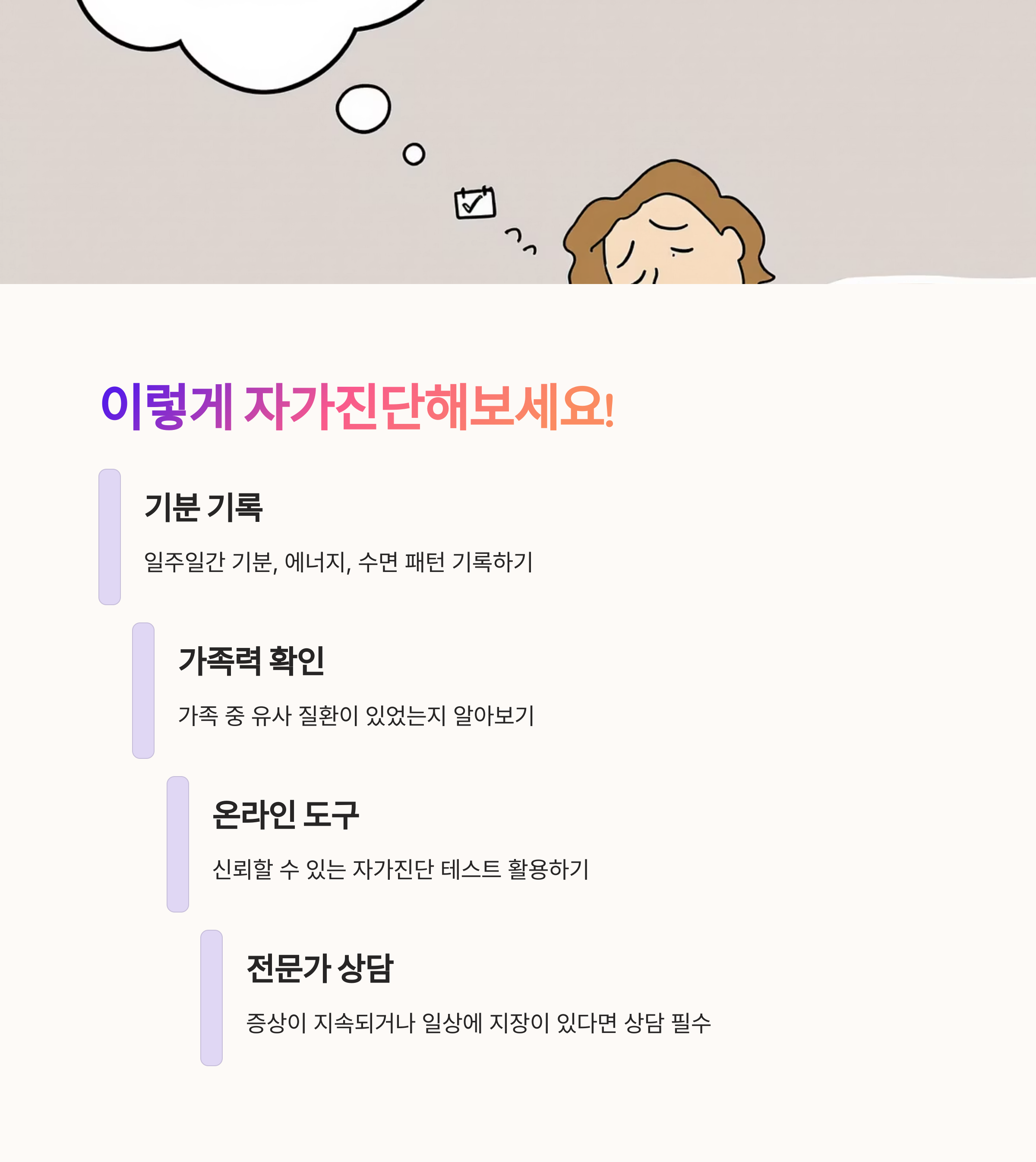 조울증 자가진단은 자신의 기분 변화를 관찰하며 시작해요. 전문가 진단을 대체할 수는 없지만, 초기 점검으로 유용합니다. 제가 지인의 증상을 기록하며 사용했던 간단한 자가진단 방법을 공유할게요.