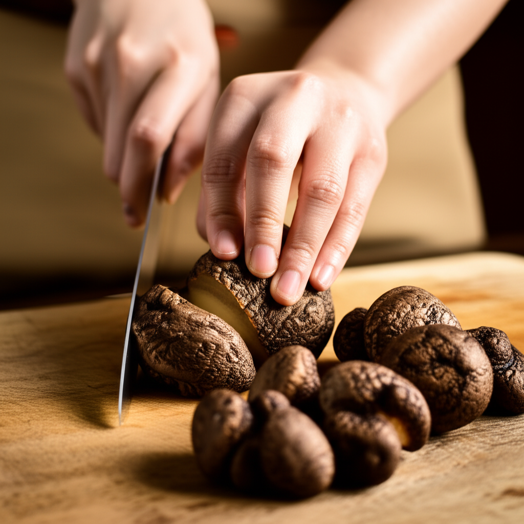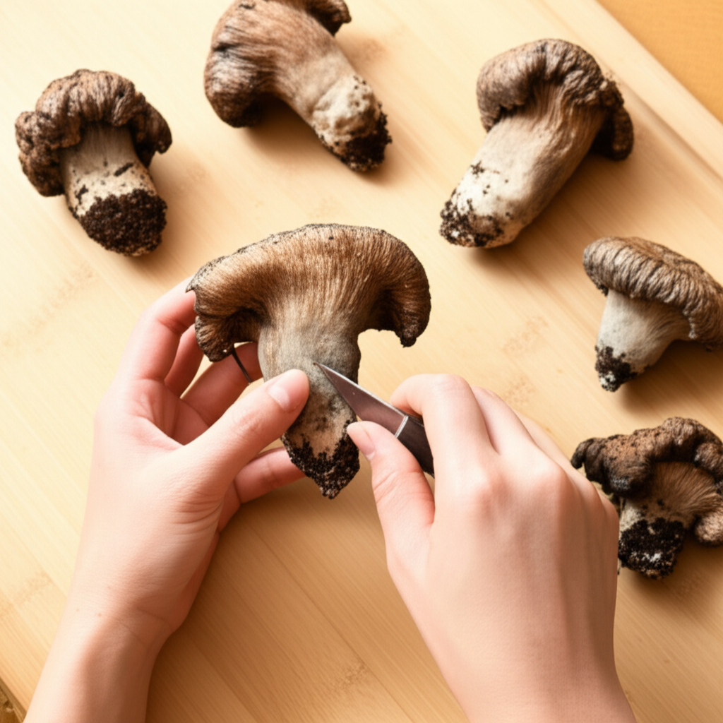 채취한 능이버섯은 흙이나 이물질을 부드러운 솔로 털어내거나, 흐르는 물에 가볍게 씻어냅니다. 너무 오래 물에 담그면 향이 약해질 수 있으니 주의하세요. 밑동의 지저분한 부분은 칼로 잘라내면 됩니다. 능이버섯 산행의 마지막 단계죠.