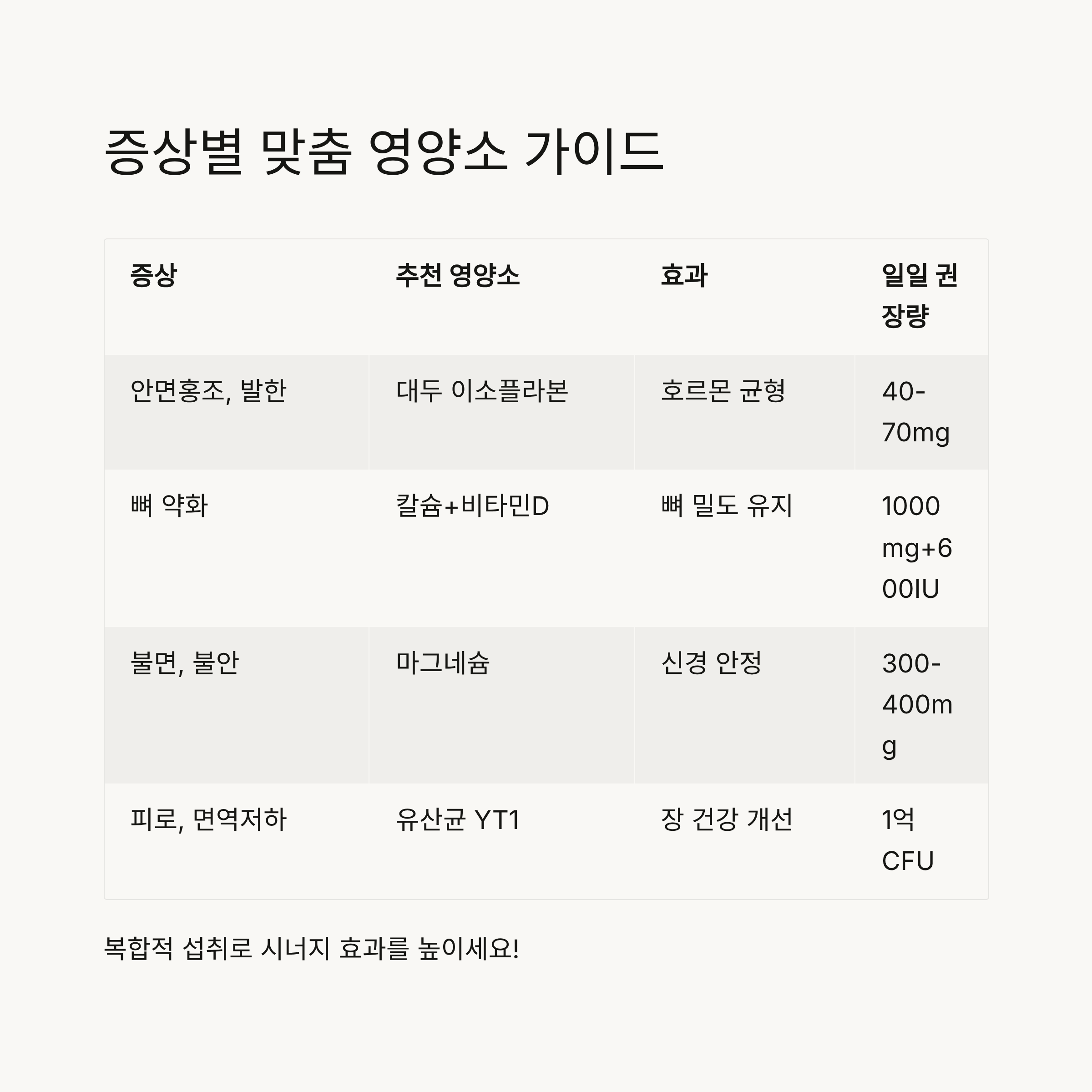 갱년기 영양제 추천을 하다 보면, 모든 게 다 필요하지만 증상에 따라 우선순위를 두는 게 좋아요. 저는 개인적으로 대두 이소플라본부터 시작했는데, 콩 제품을 좋아하지 않아 영양제로 대체하니 훨씬 편했어요. 아래에 주요 증상과 추천 영양소를 정리해봤어요. 이걸 보면서 자신에게 맞는 걸 골라보세요.