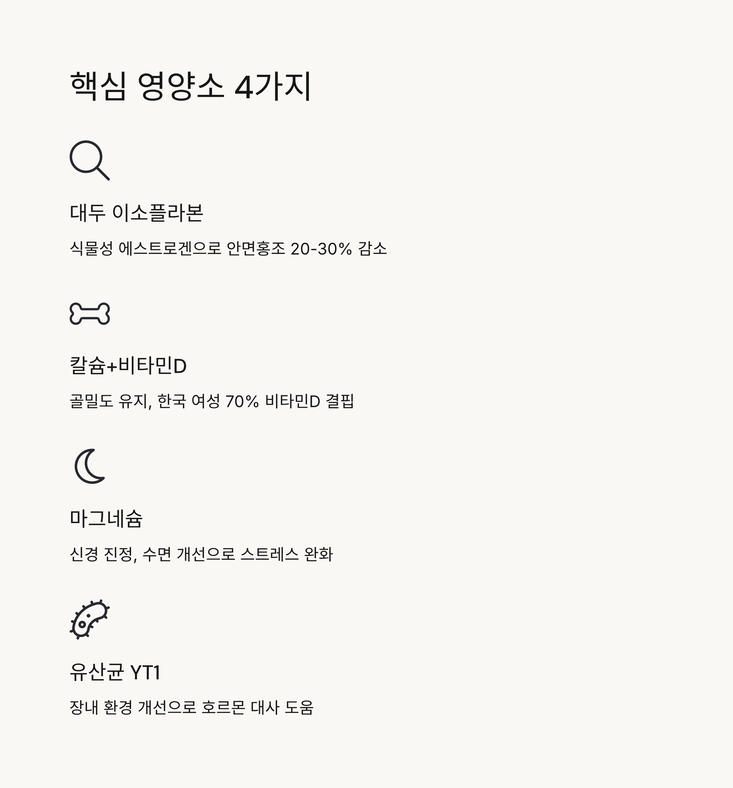 | 안면홍조, 발한 | 대두 이소플라본 | 호르몬 균형 도와 증상 완화 | 40-70mg |