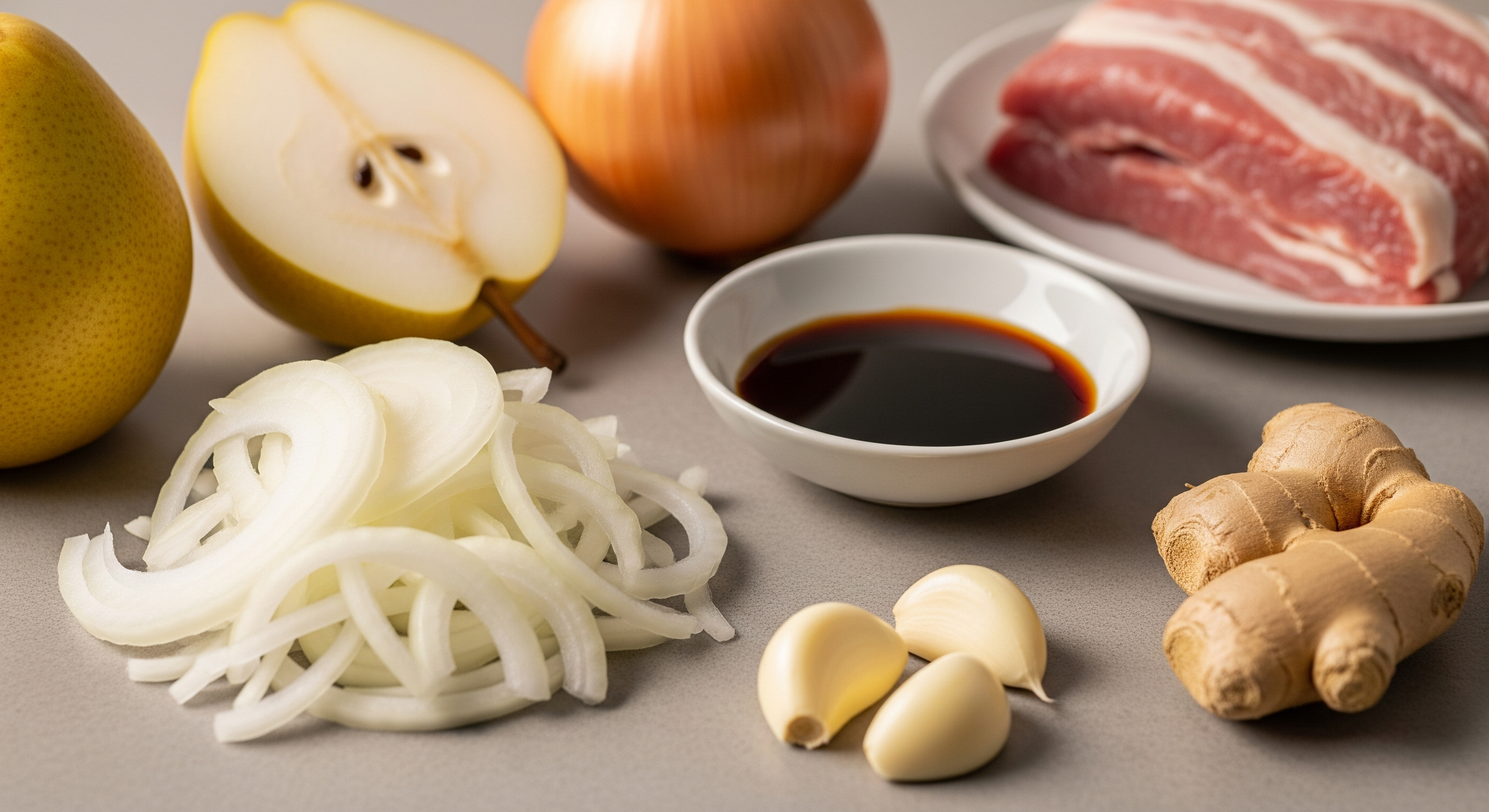 배와 양파는 껍질을 벗기고 적당한 크기로 잘라 믹서기에 넣어 곱게 갈아줍니다. 이렇게 갈아 넣은 과일과 채소는 고기를 부드럽게 만드는 연육 작용을 도와주고, 설탕만으로는 낼 수 없는 깊고 은은한 단맛을 더해줍니다. 이 과정이 바로 시판 양념과는 차별화되는 맛의 비결입니다.