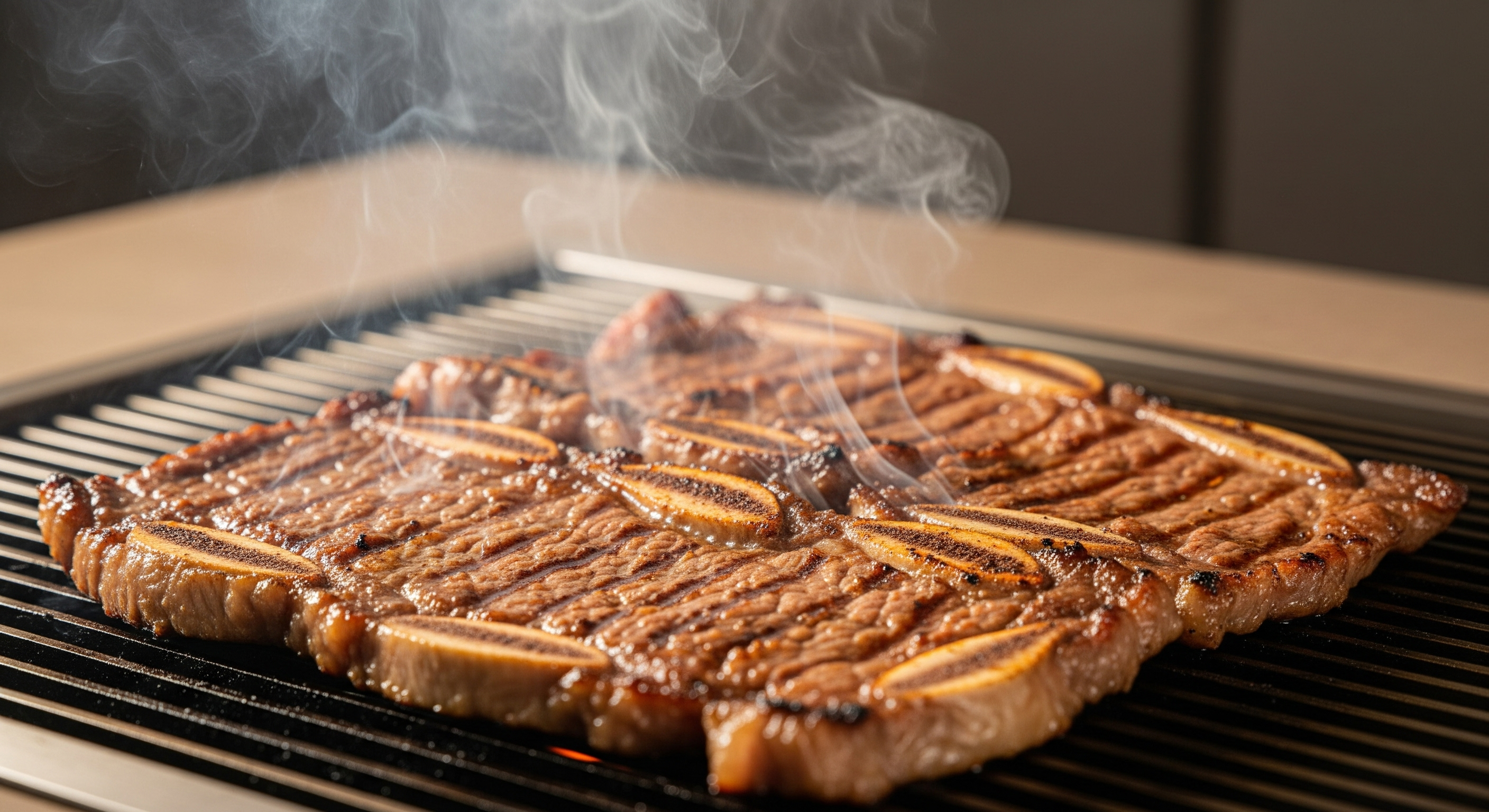 정성껏 재운 LA갈비, 이제 맛있게 굽는 일만 남았습니다. 양념된 고기는 쉽게 탈 수 있으므로 불 조절이 매우 중요합니다. 달군 팬에 중불로 예열한 뒤, 갈비를 올려 앞뒤로 노릇하게 구워주세요.