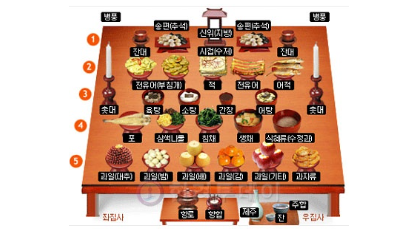 상은 5열로 구성되는데, 위쪽부터 신위와 향로, 그 아래로 밥·국, 나물·전, 과일, 술·차 순서예요.