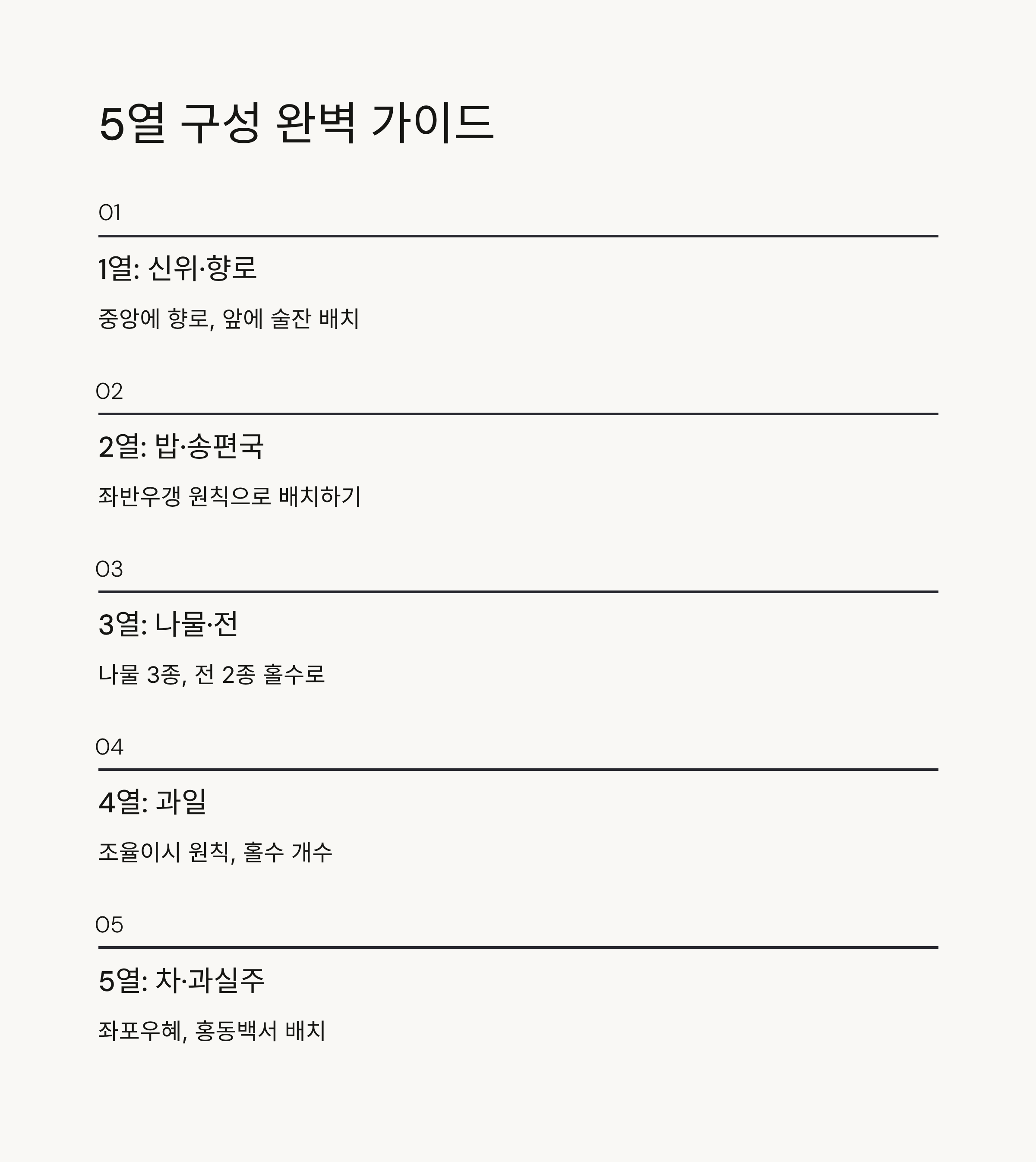 모든 음식은 홀수 개로 올리는 게 전통이에요. 저는 처음엔 이 원칙만 외우고 시작했는데, 나머지는 자연스레 따라오더라고요. 📌