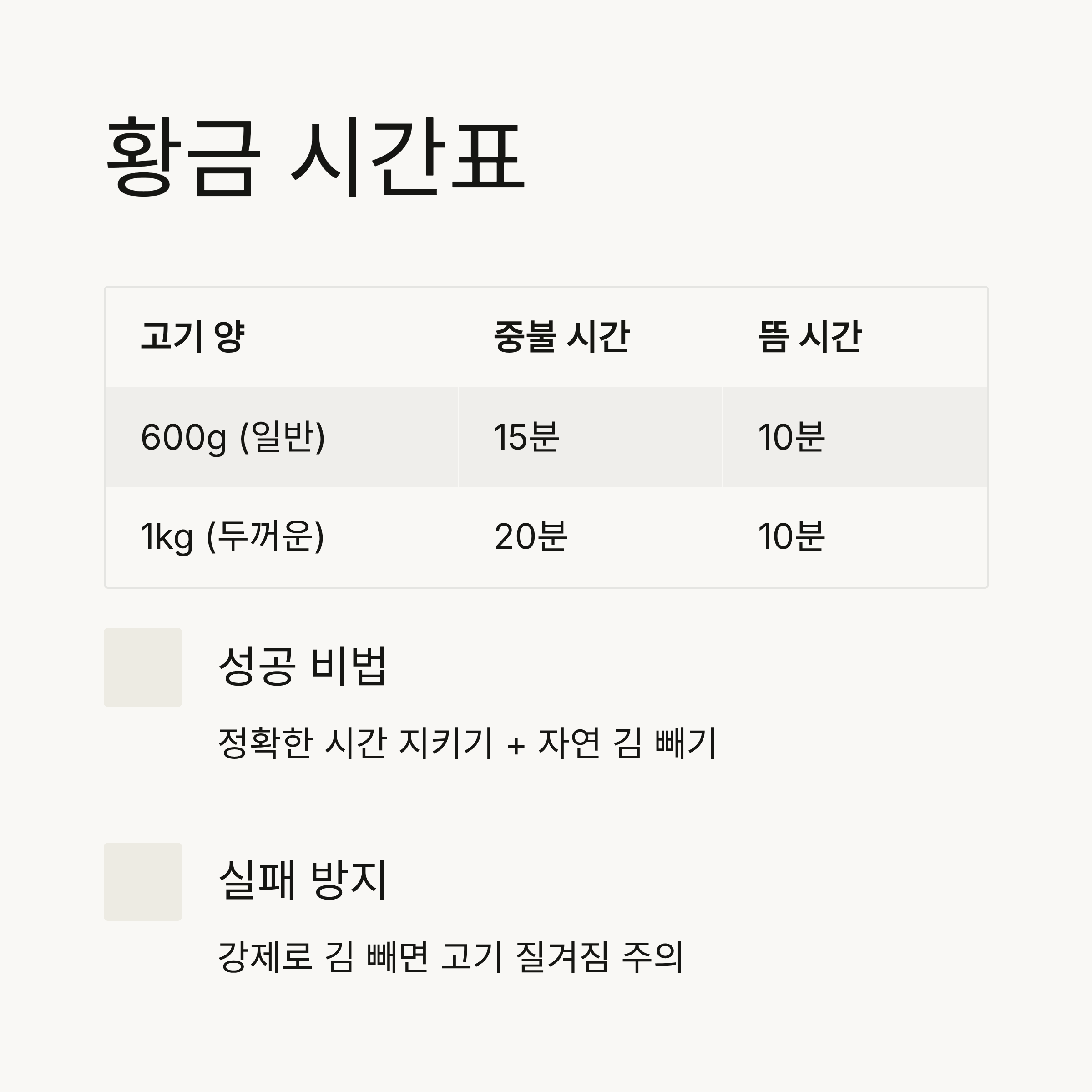 | 고기 양 (두께) | 중불 가열 시간 (추가 흔들린 후) | 뜸 들이는 시간 |