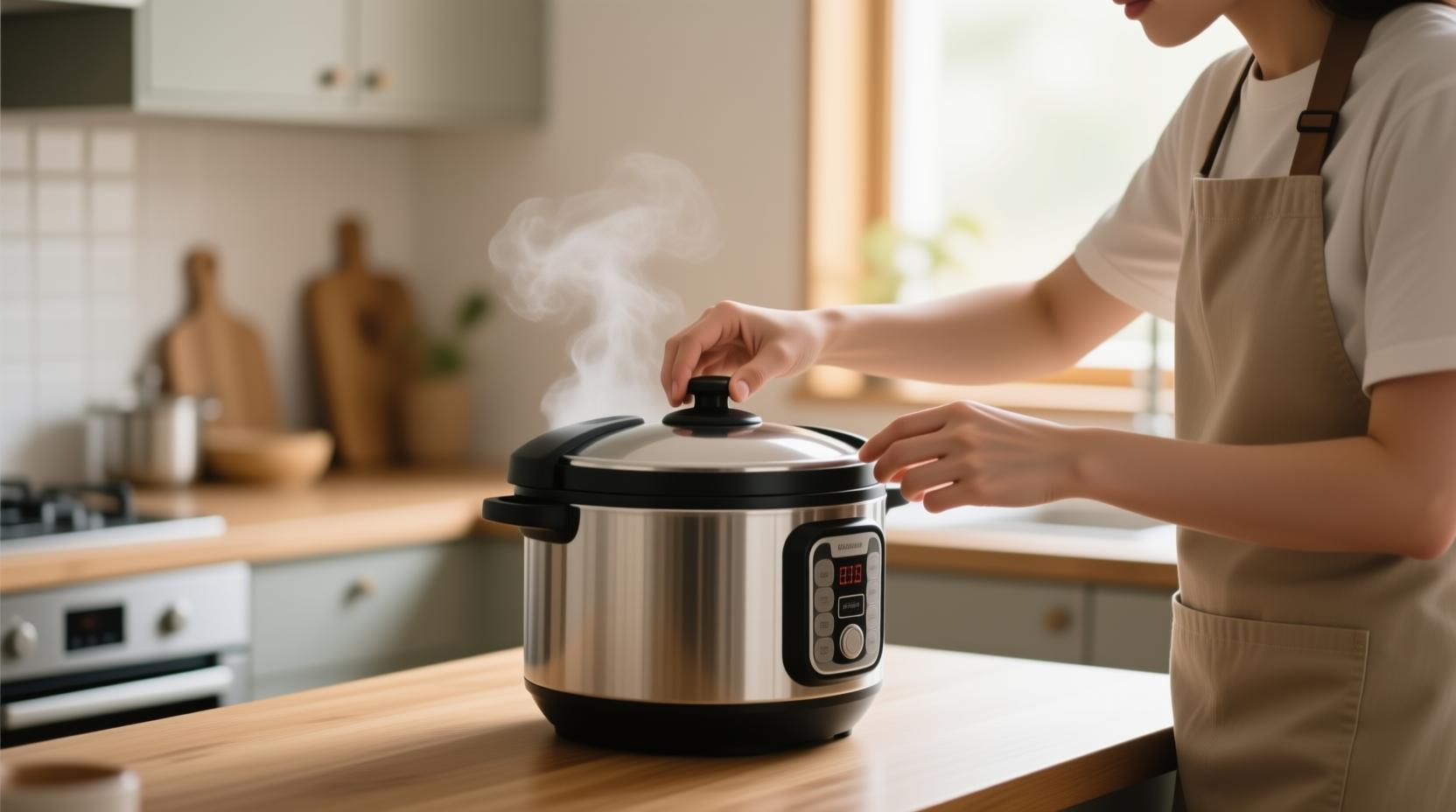 3. 뚜껑을 닫고 센 불에서 가열하다가, 압력솥의 추가 흔들리며 소리가 나기 시작하면 중불로 줄여 15~20분간 삶아줍니다. 바로 이 단계가 완벽한 삼겹살 돼지 압력밥솥 수육 삶는 시간을 결정하는 핵심입니다.