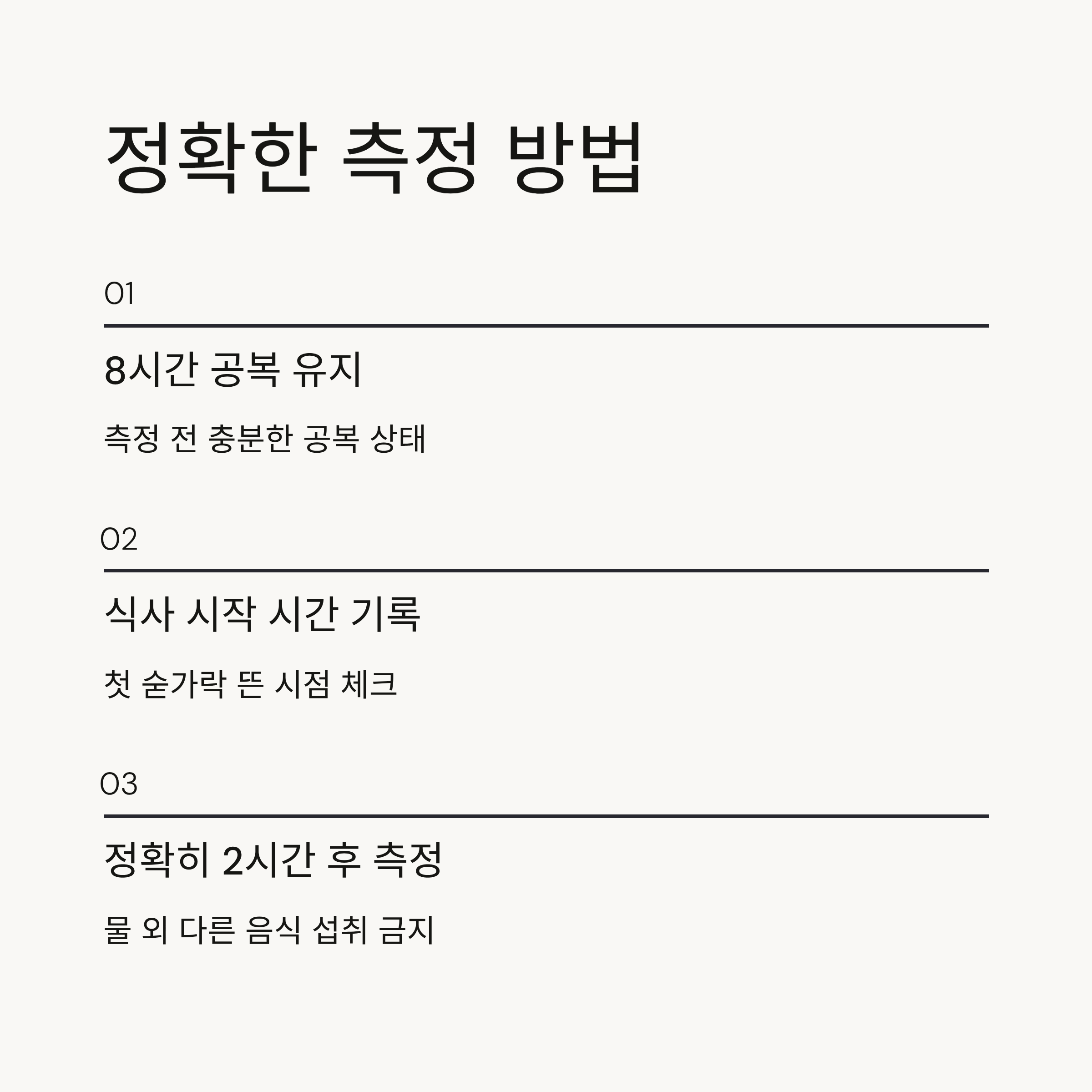 둘째, 측정 전 8시간 이상 공복 상태를 유지해야 하므로 주로 아침 식사 후 측정하는 것이 좋습니다. 셋째, 물 이외의 다른 음료나 간식을 섭취하면 안 됩니다.