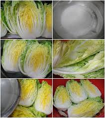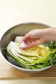 3. 배추를 소금물에 한번 푹 적신 뒤, 배추 줄기 부분에 남은 소금(0.5컵)을 켜켜이 뿌려줍니다.