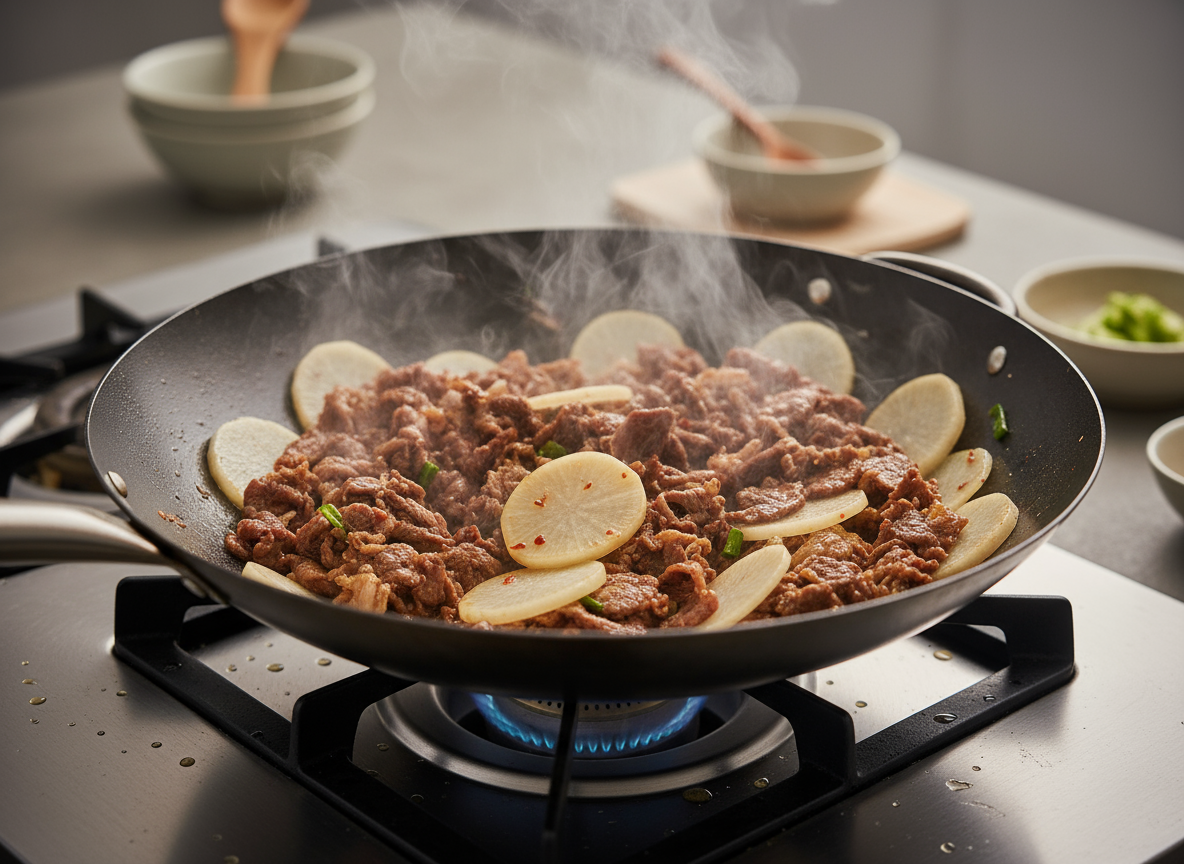 중불로 달군 냄비에 들기름 2스푼을 두르고, 키친타월로 핏물을 제거한 소고기를 넣어 달달 볶아줍니다. 소고기 겉면이 익으면서 고소한 냄새가 올라오면 나박 썬 무를 넣고 함께 볶아주세요. 무가 살짝 투명해질 때까지 볶아주면 무의 시원한 맛과 소고기의 감칠맛이 어우러져 국물 맛이 훨씬 깊어져요.