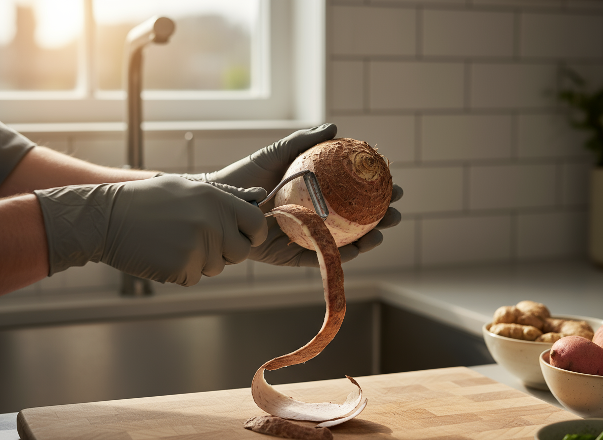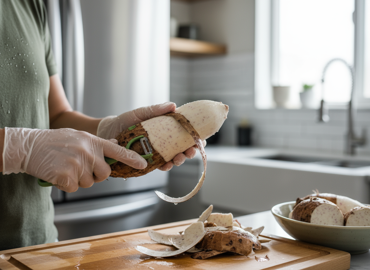 맨손으로 토란을 만지면 손이 가려워서 고생할 수 있어요. 껍질을 벗기기 전부터 꼭 고무장갑이나 비닐장갑을 착용하세요.