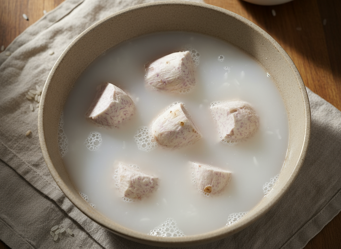 ✅ 쌀뜨물 활용: 멸치다시마 육수도 좋지만, 쌀뜨물을 사용하면 쌀의 전분질이 토란의 떫은맛을 중화시키고 국물을 더욱 부드럽고 구수하게 만들어 줍니다.