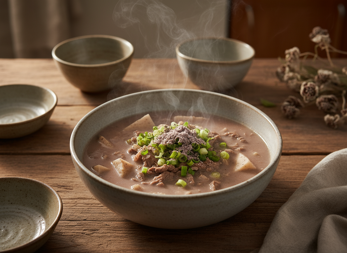 A: 끓이면서 올라오는 거품을 잘 걷어내셨나요? 소고기 핏물이나 토란의 불순물이 거품으로 올라오는데, 이걸 걷어내야 국물이 깔끔해요. 만약 들깨가루를 넣어 뽀얗고 걸쭉해진 것이라면 그건 자연스러운 현상이니 걱정 안 하셔도 됩니다.