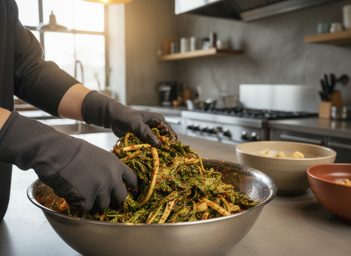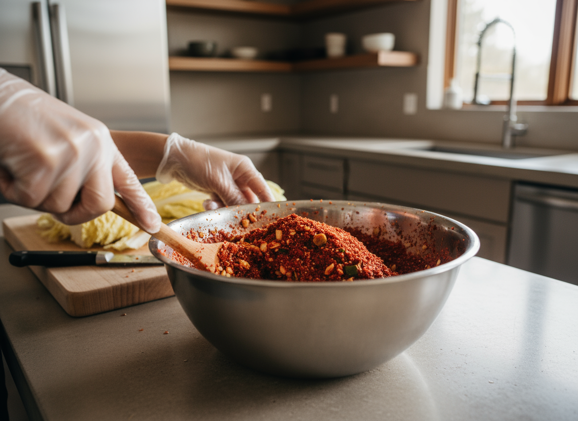 💡 여기서 꿀팁! 갓은 향이 강한 채소라 마늘이나 생강을 너무 많이 넣으면 오히려 쓴맛이 날 수 있어요. 레시피보다 조금 적게 넣는 것이 갓 고유의 향을 살리는 비법이랍니다. 양념을 만든 후 10분 정도 두어 고춧가루 색이 곱게 우러나도록 합니다.
