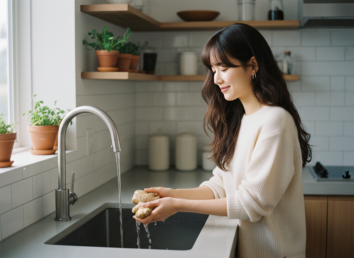 먼저 생강을 물에 10~20분 정도 불려 틈새에 낀 흙을 제거합니다. 깨끗한 수세미나 솔로 문질러 굵은 흙먼지를 꼼꼼히 씻어내 주세요.