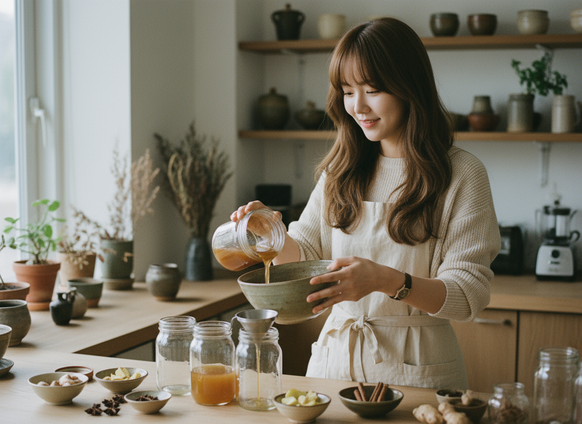 | 저온 숙성 (끓이지 않음) | 생강의 효소나 영양소 파괴가 적음. 과정이 간편함. | 설탕이 녹는 데 시간이 오래 걸림. 보관 기간이 상대적으로 짧음. |