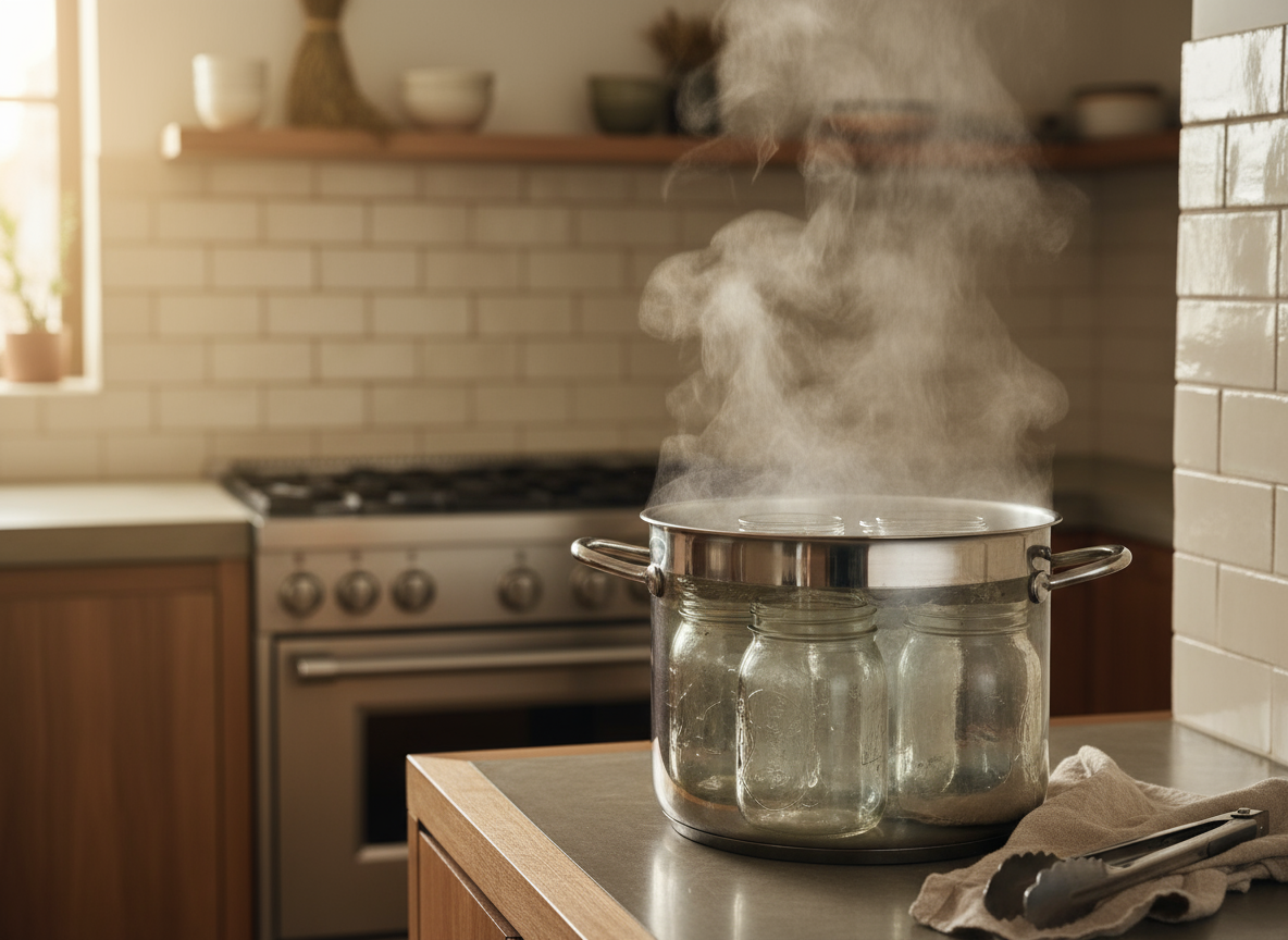 생강청을 담을 유리병은 반드시 열탕 소독을 해야 합니다. 냄비에 찬물을 담고 유리병을 거꾸로 세워 넣은 뒤, 물이 끓기 시작하면 5~10분 정도 더 끓여 증기로 소독합니다. 꺼낼 때는 집게로 조심스럽게 꺼내어 물기가 완전히 마르도록 자연 건조합니다. (절대 찬물로 헹구지 마세요! 깨질 수 있습니다.)
