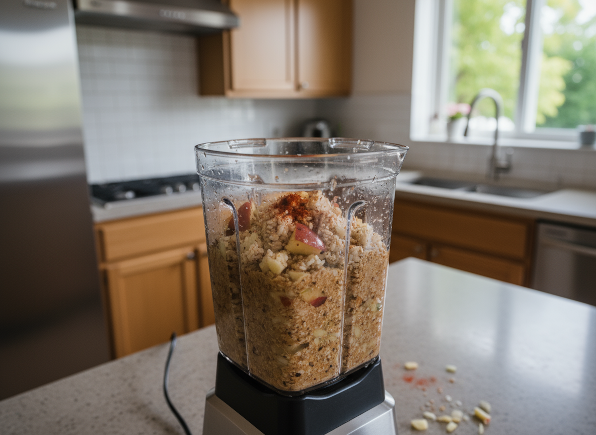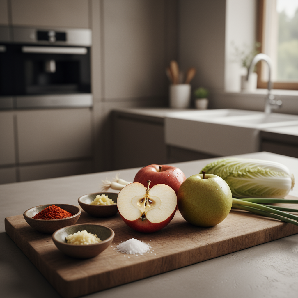 무가 절여지는 동안 양념을 만듭니다. 믹서기에 찬밥 3큰술, 껍질 벗겨 숭덩숭덩 썬 사과 반 개, 양파 반 개, 새우젓 3큰술, 멸치액젓 5큰술을 넣고 곱게 갈아줍니다. 찹쌀풀을 쑤는 번거로움 없이도 밥이 그 역할을 대신하며, 사과와 양파가 천연의 시원한 단맛을 내줍니다.