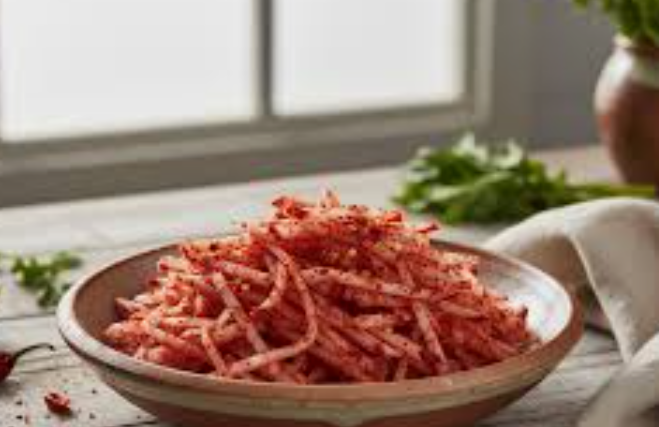 무 8kg를 채 써는 것도 정말 큰일이죠. 채칼을 사용하시는 것을 적극 권장합니다. 채 썬 무는 아주 큰 대야에 담고, 준비한 굵은 고춧가루(4kg)의 약 2/3 정도만 먼저 부어서 버무려주세요. 이렇게 무에 먼저 고춧가루 색을 입혀두면, 무에서 수분이 나와 겉돌지 않고 양념 색이 아주 곱게 나옵니다.